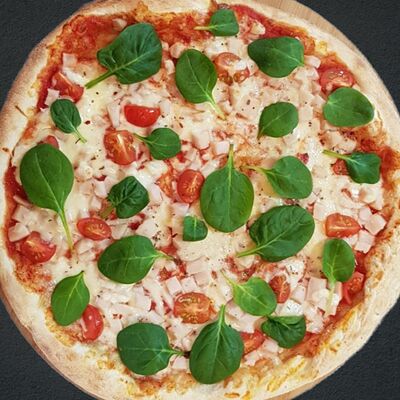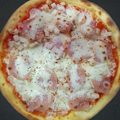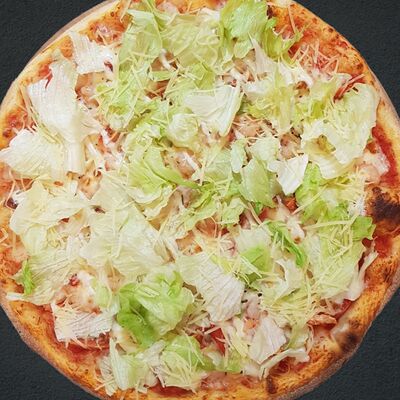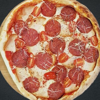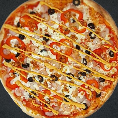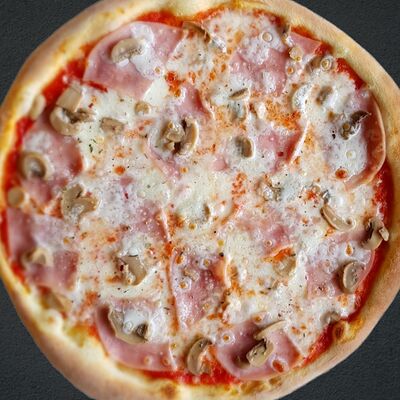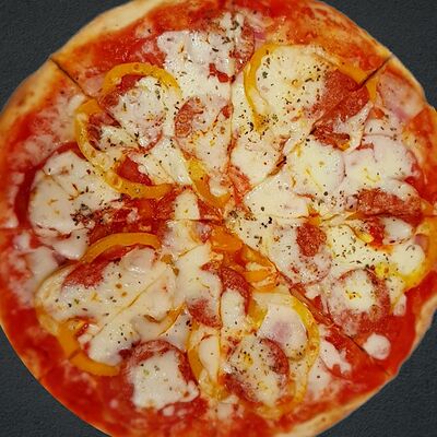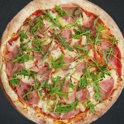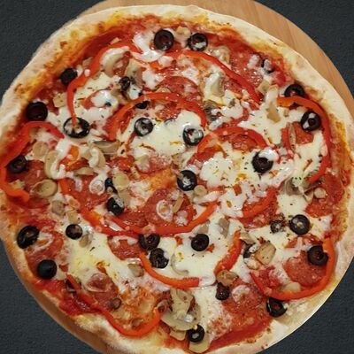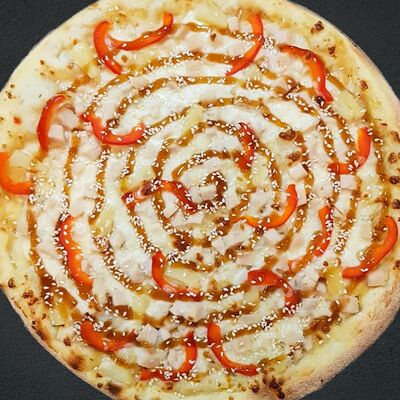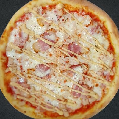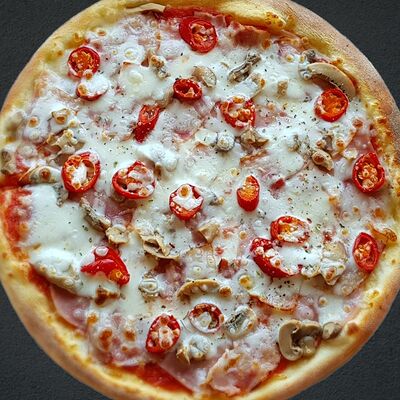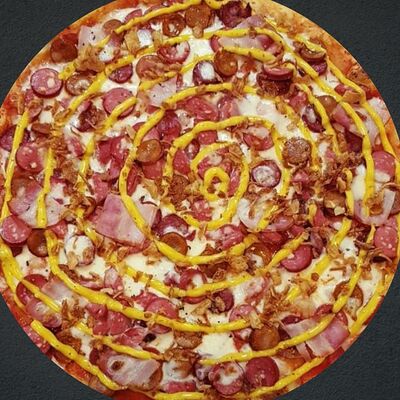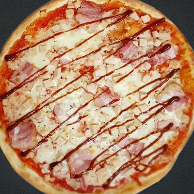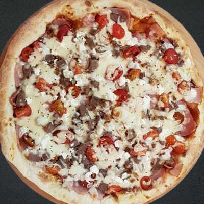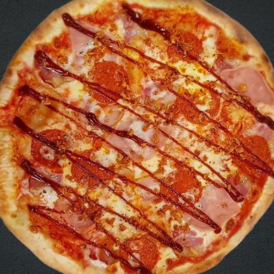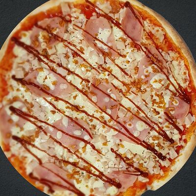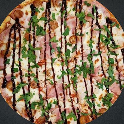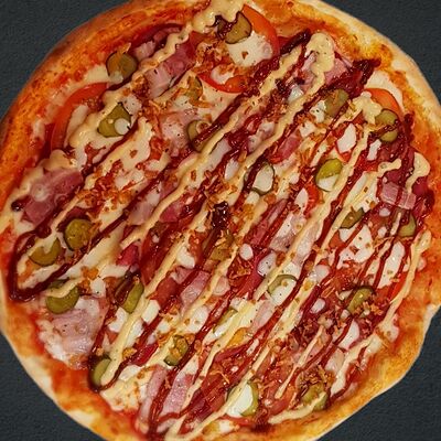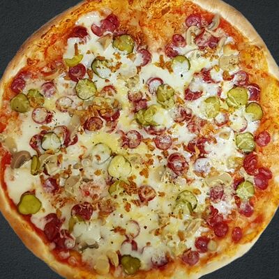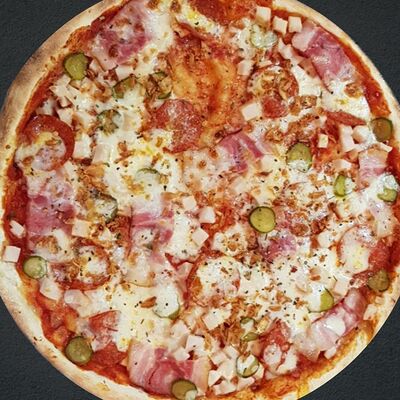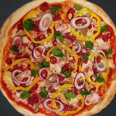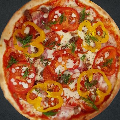 Соус пицца, моцарелла, говядина, бекон, охотничьи колбаски, грибы, сладкий перец, лук красный, зелень, тесто (33 см)