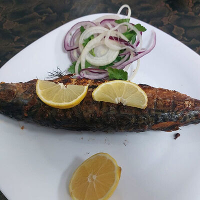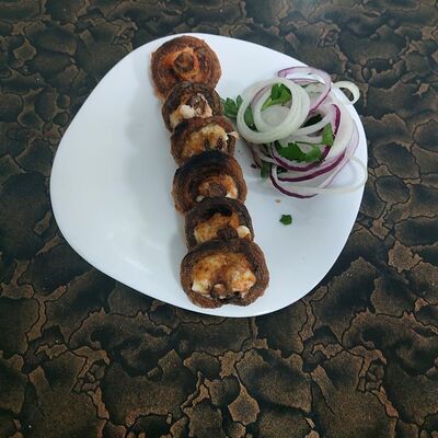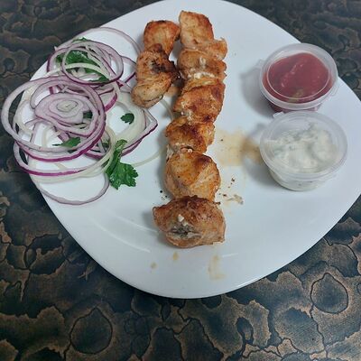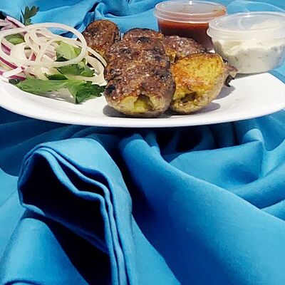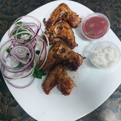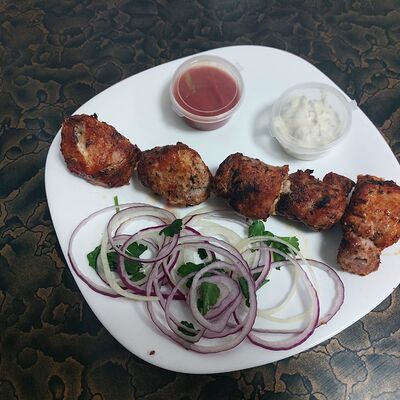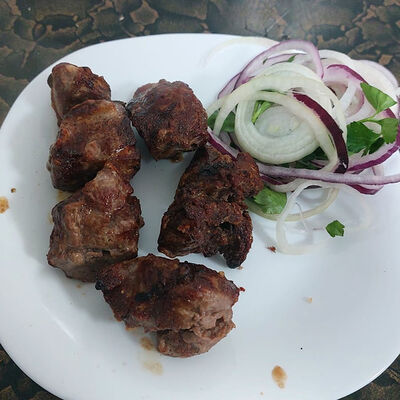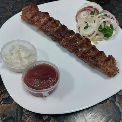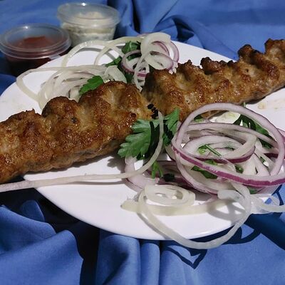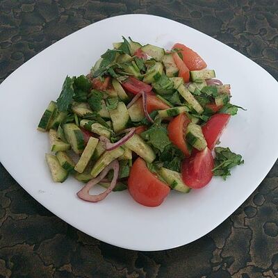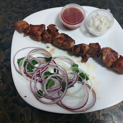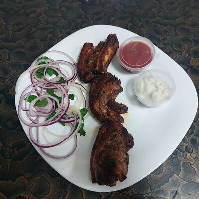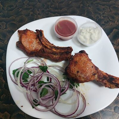 Корейка свиная (часть) в маринаде, зелень, белый лук, красный лук