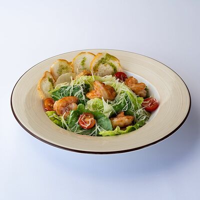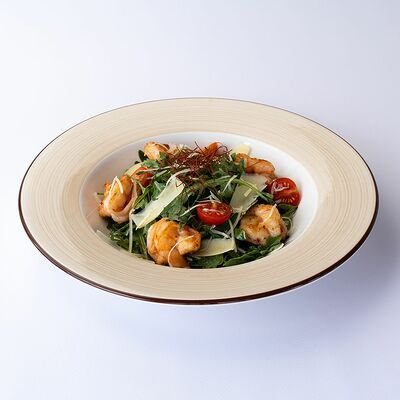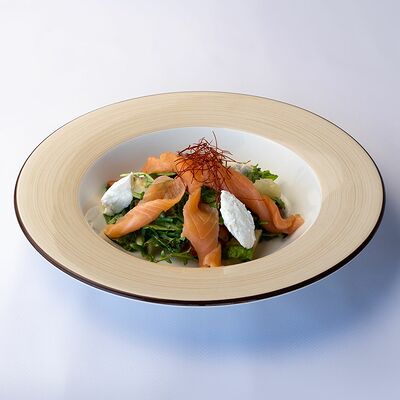 Сочные листья романо и руколы, творожный сыр, ананас, помидоры черри, слабосоленая семга и апельсиновая заправка