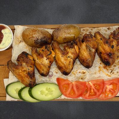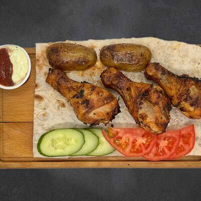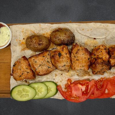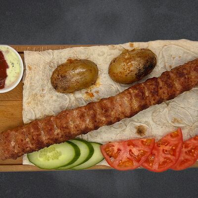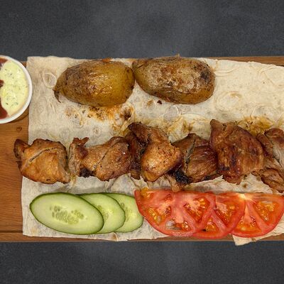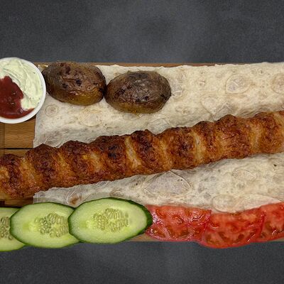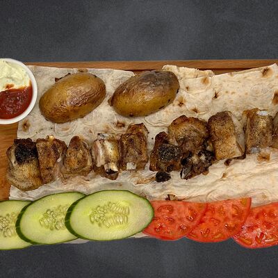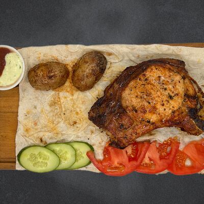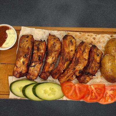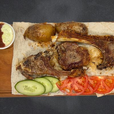 Свиные рёбра, помидор, огурец, лук, картофель, соус, лаваш