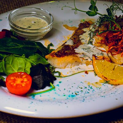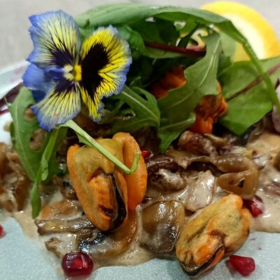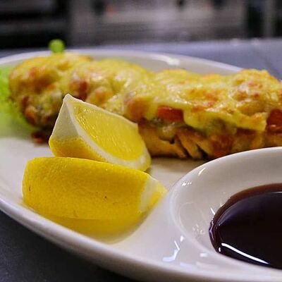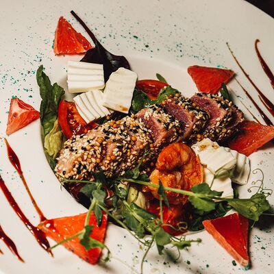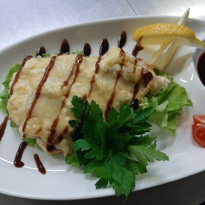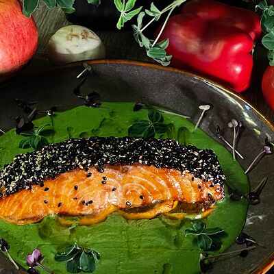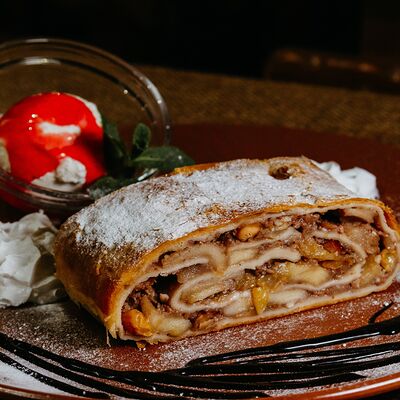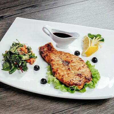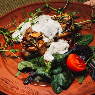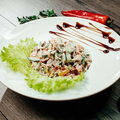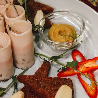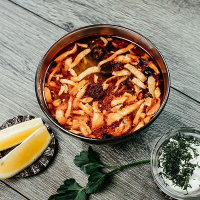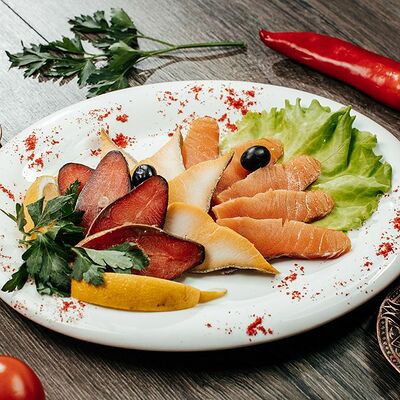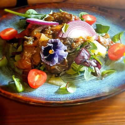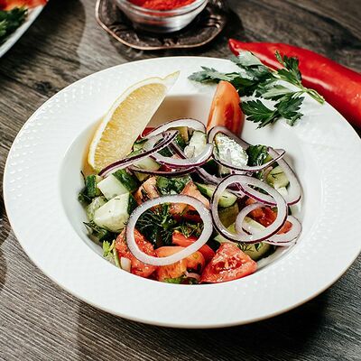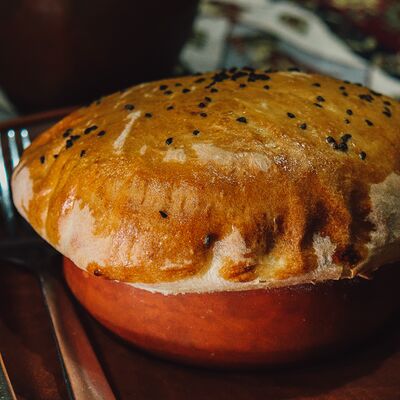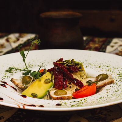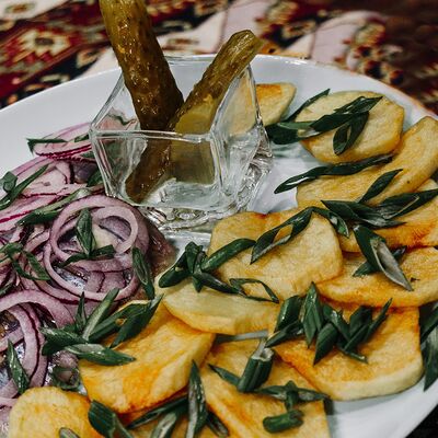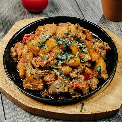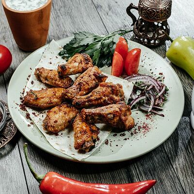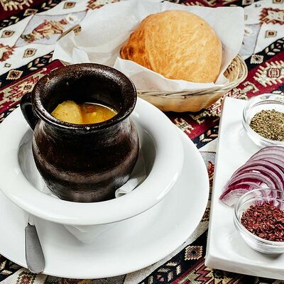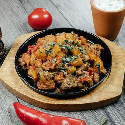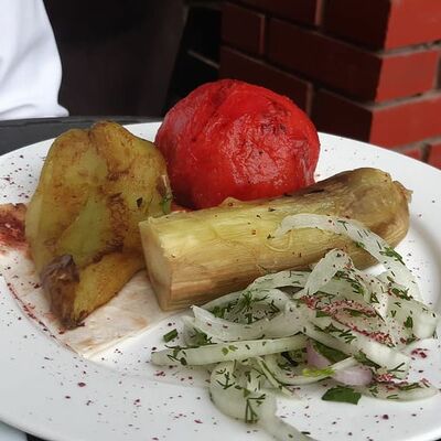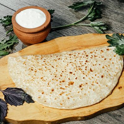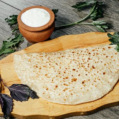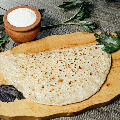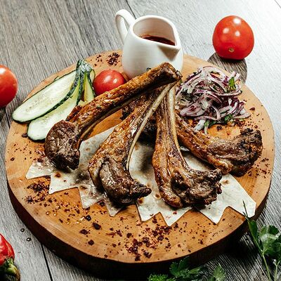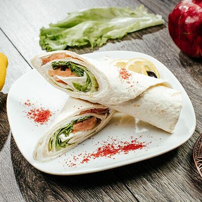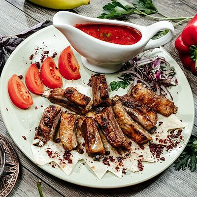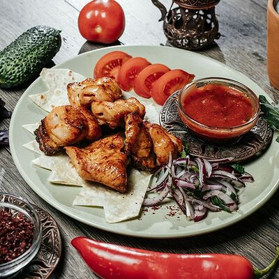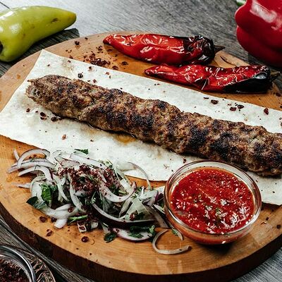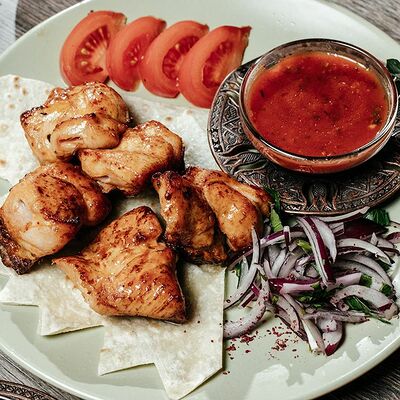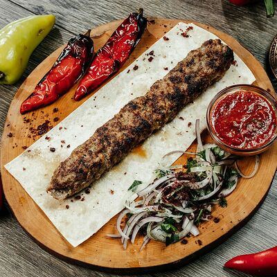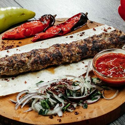 Мякоть телятины, лаваш, домашняя аджика, маринованный лук