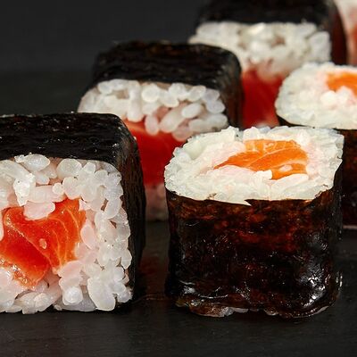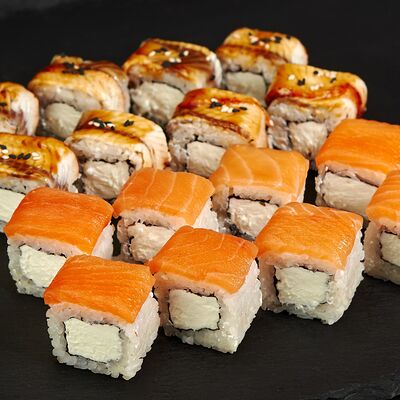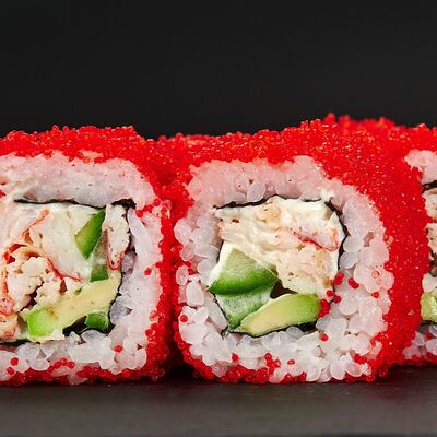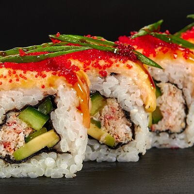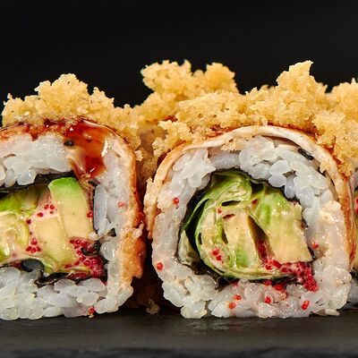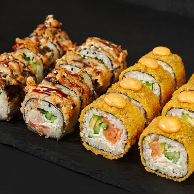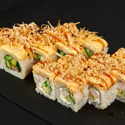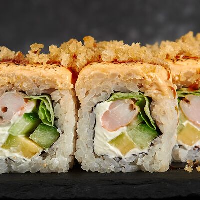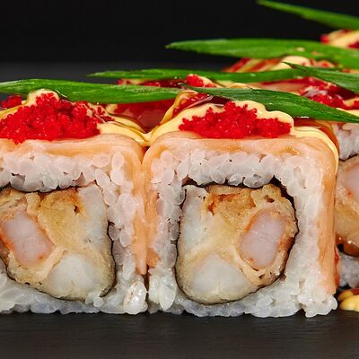Лосось, тигровые креветки, соус манго, соус унаги, масаго, темпурная крошка, 8 шт