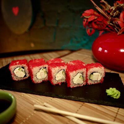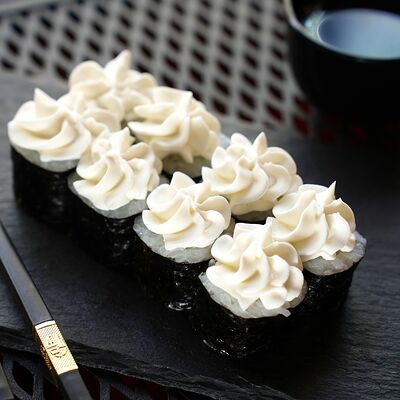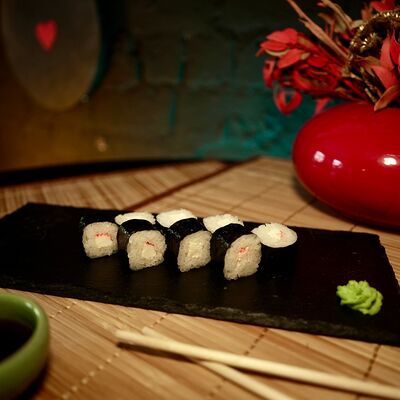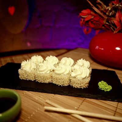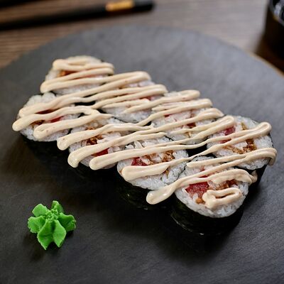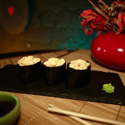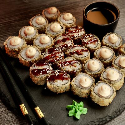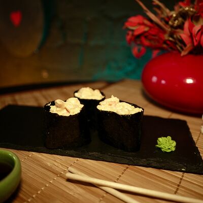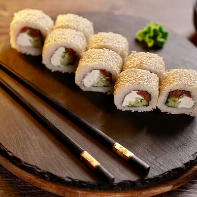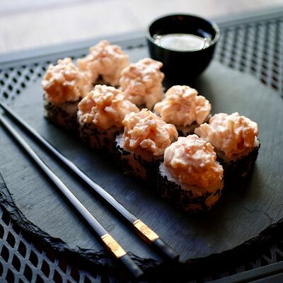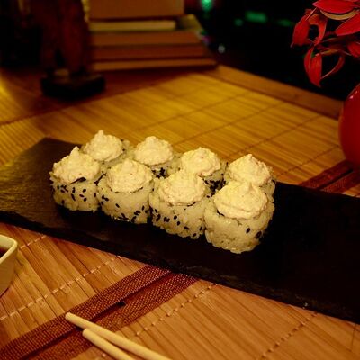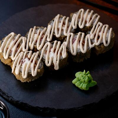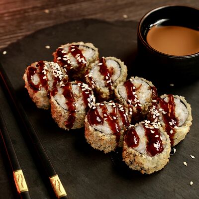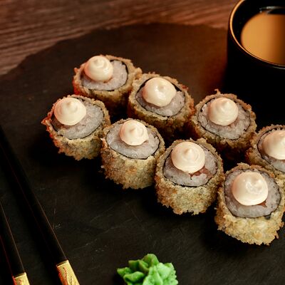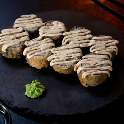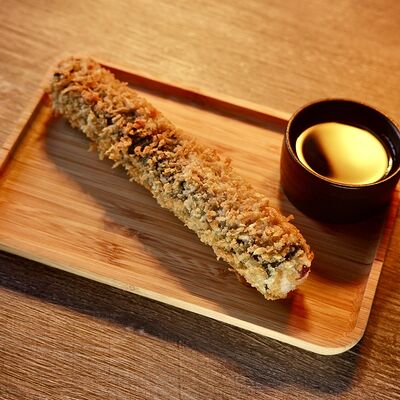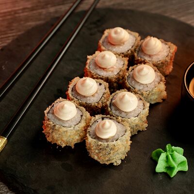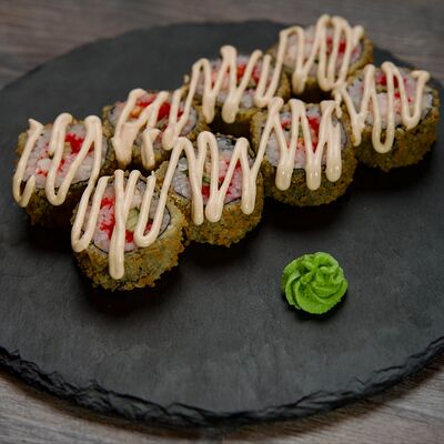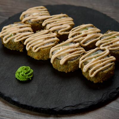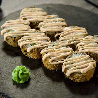Рис, сыр творожный Cremette, снежный краб, огурцы, нори, кляр, сухари панко, соус спайс Подается с имбирем, васаби, соевым соусом и палочками
