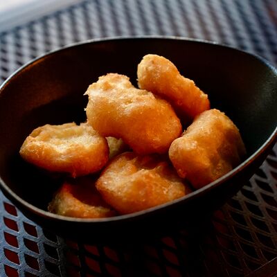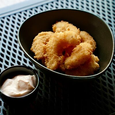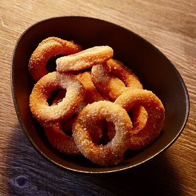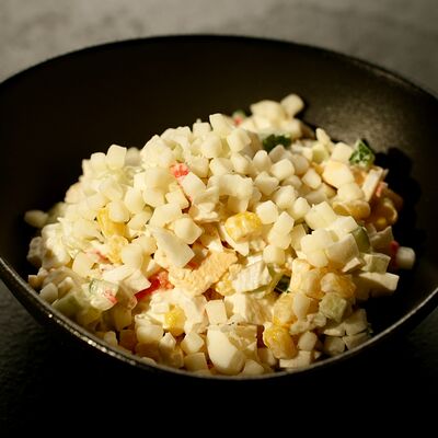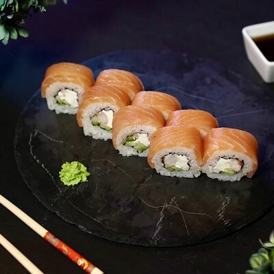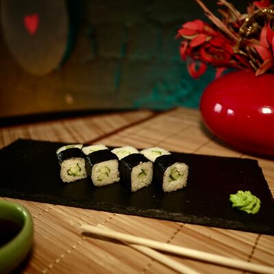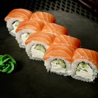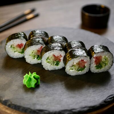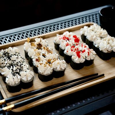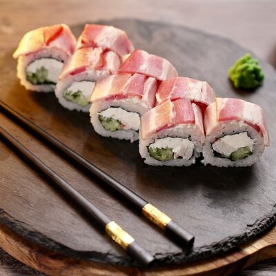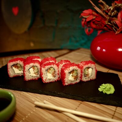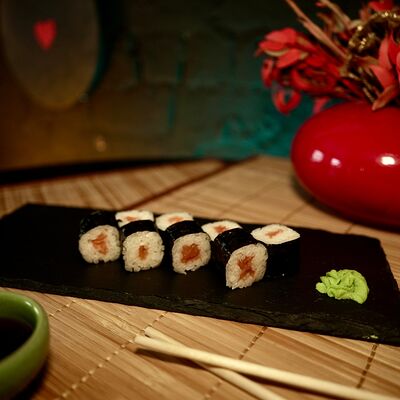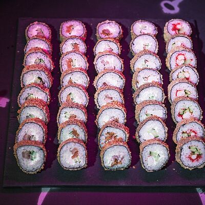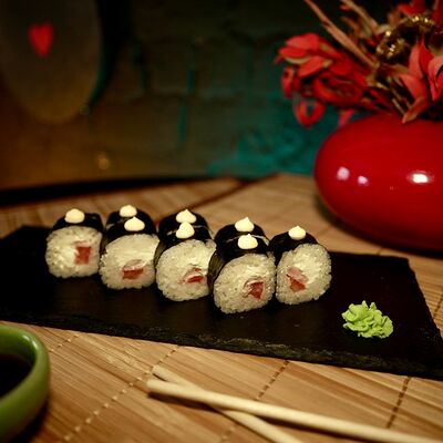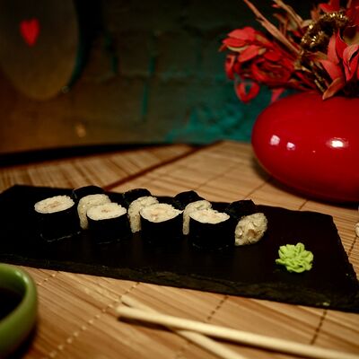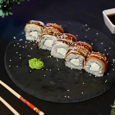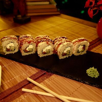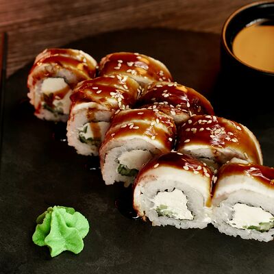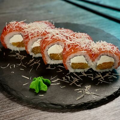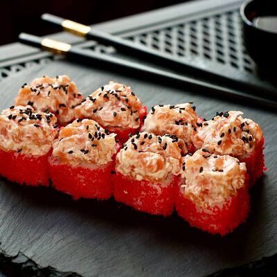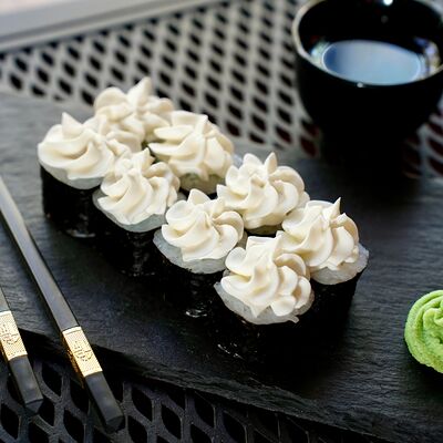 Рис, сыр творожный Cremette, снежный краб, огурцы, нори, кляр, сухари панко, соус спайс Подается с имбирем, васаби, соевым соусом и палочками