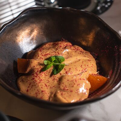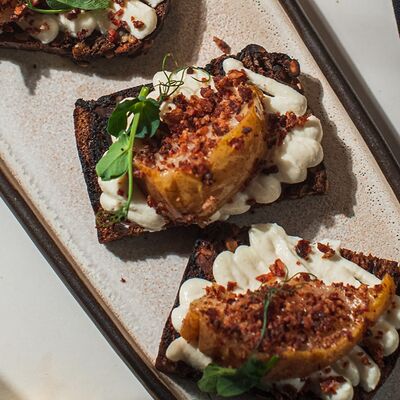 Черный зерновой хлеб, черри, сыр моцарелла, соус песто, крем рикотта
