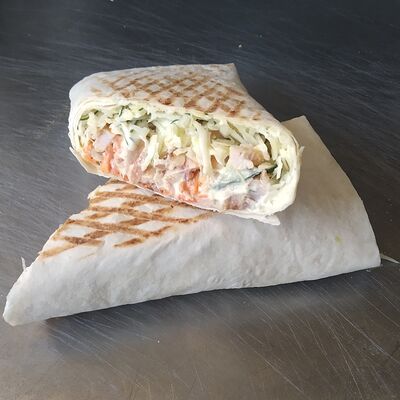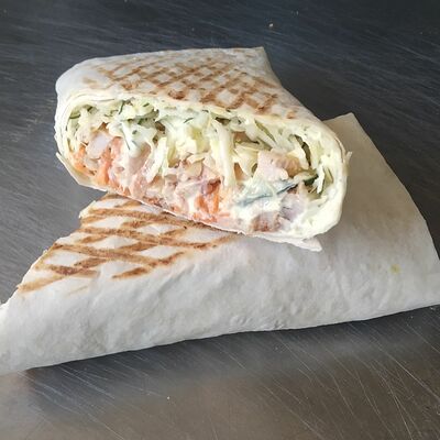 Куриное филе, капуста, морковь, помидор, огурцы, зелень, лук, лаваш, соус чесночный (острота на выбор)