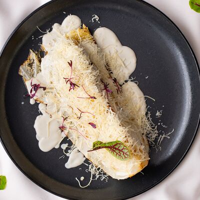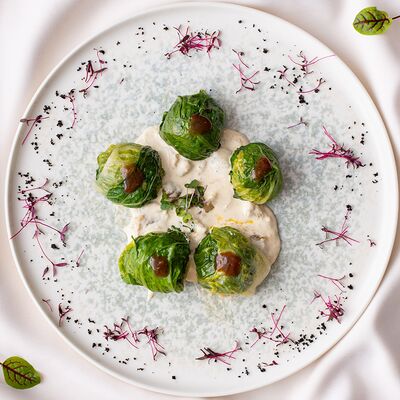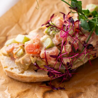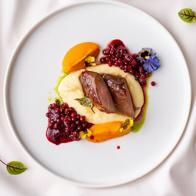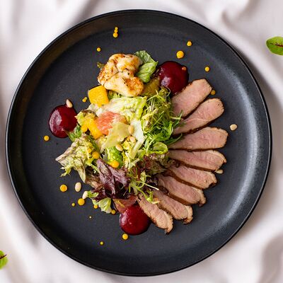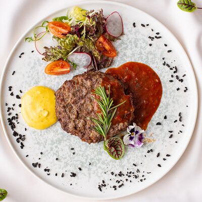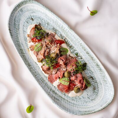 Ростбиф, соус вителло, салат, зелень, каперсы, гранат, маслины/оливки, каперсы, сыр, помидоры черри