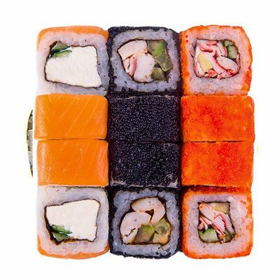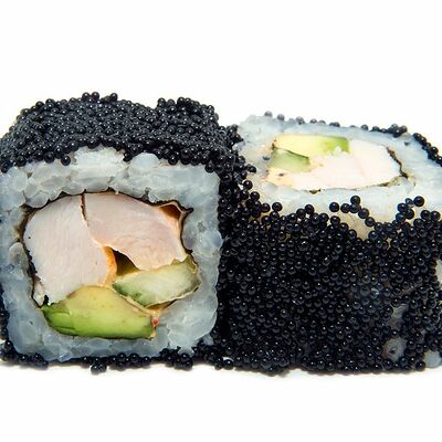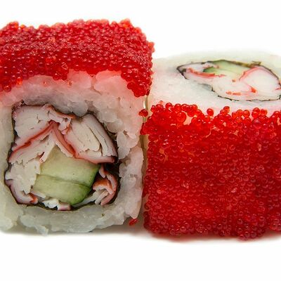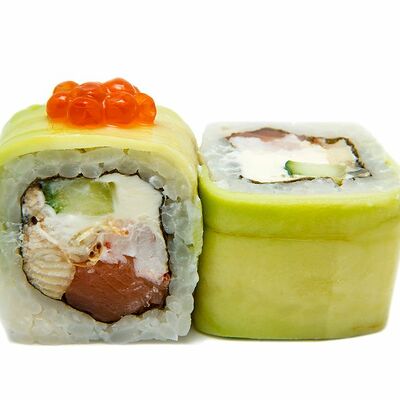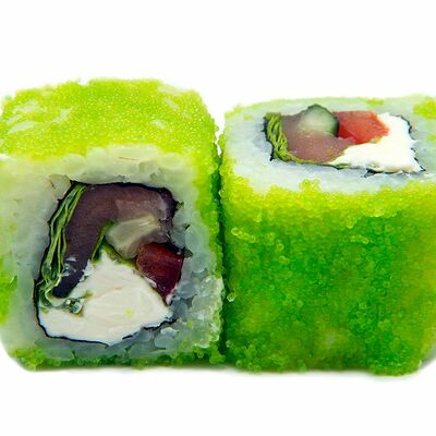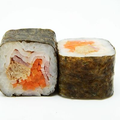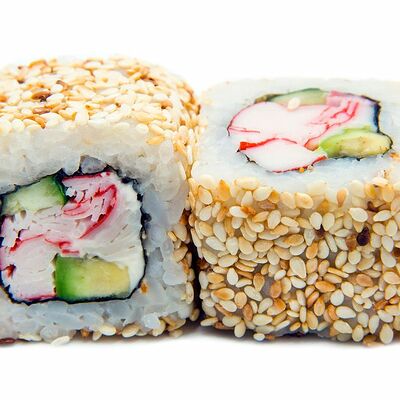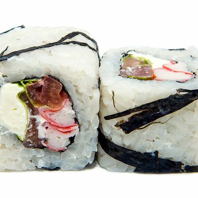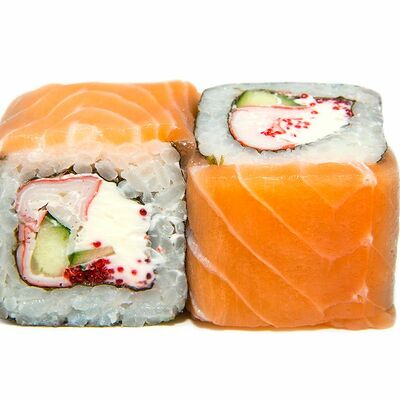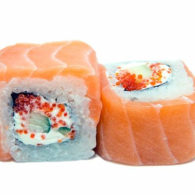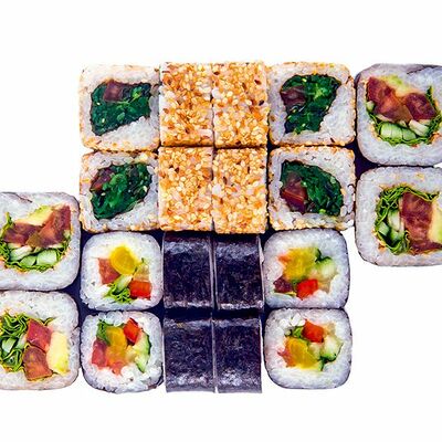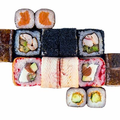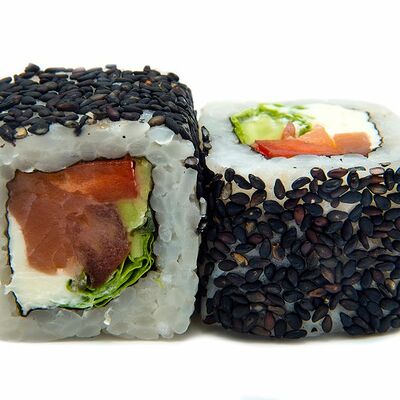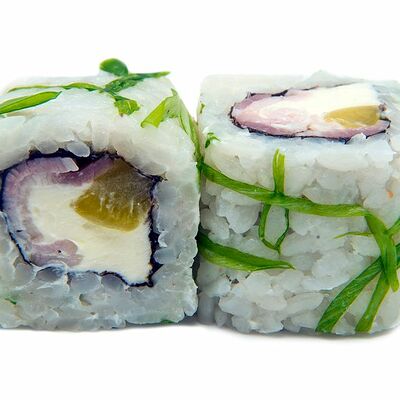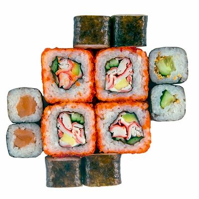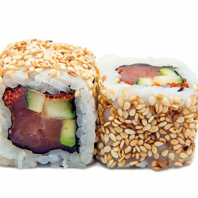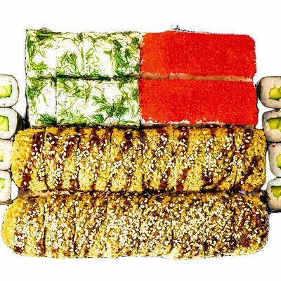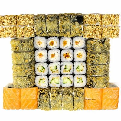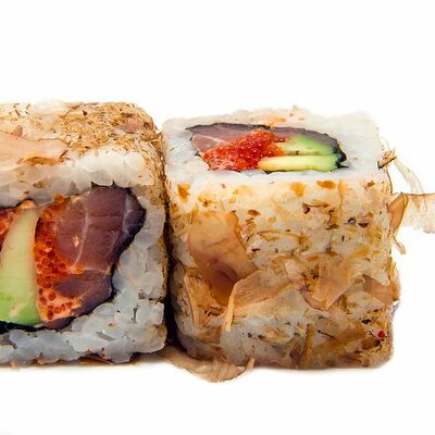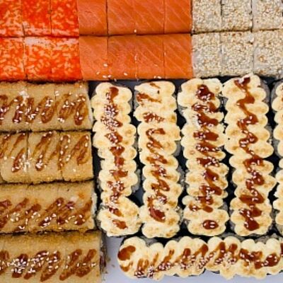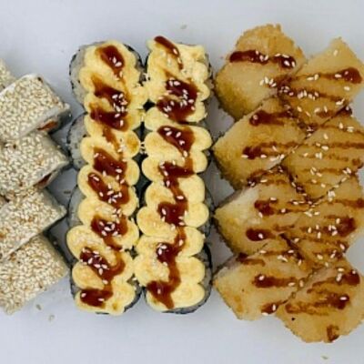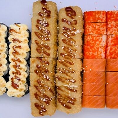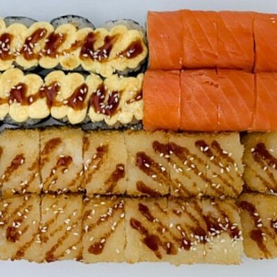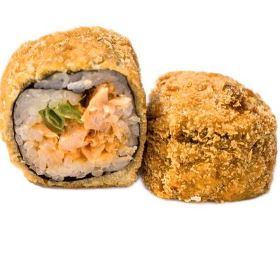Рис, лосось жареный, соус спайси, лук зеленый, сухари панировочные, темпура, унаги соус, кунжут. Имбирь, васаби, соевый соус и палочки не входят в заказ