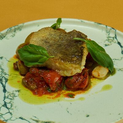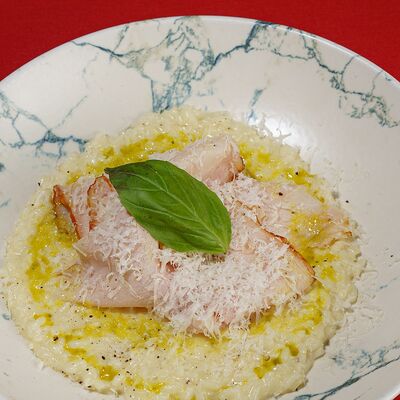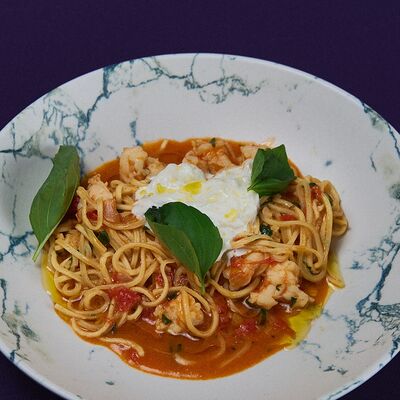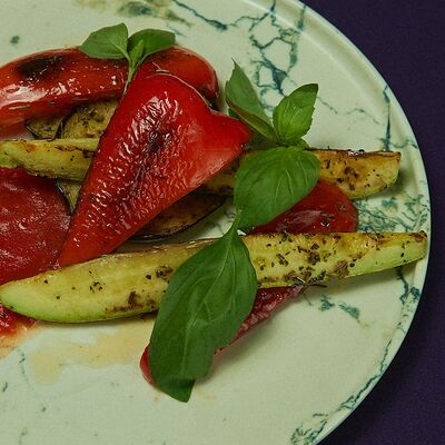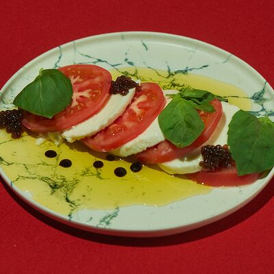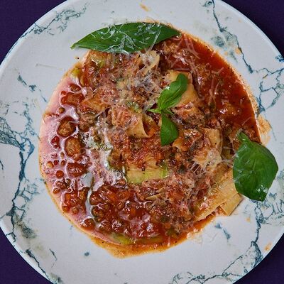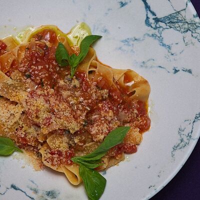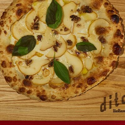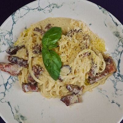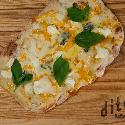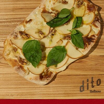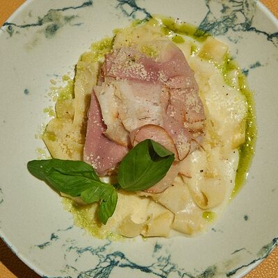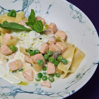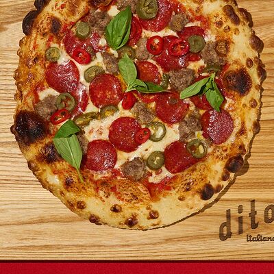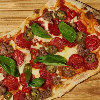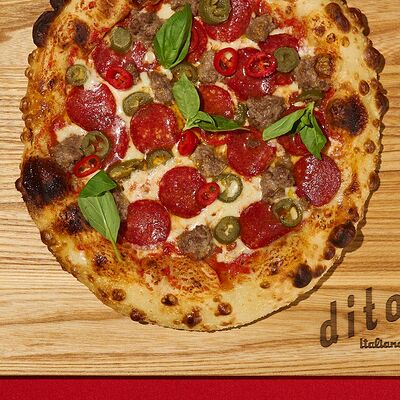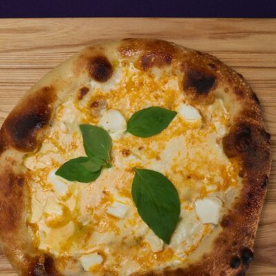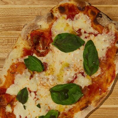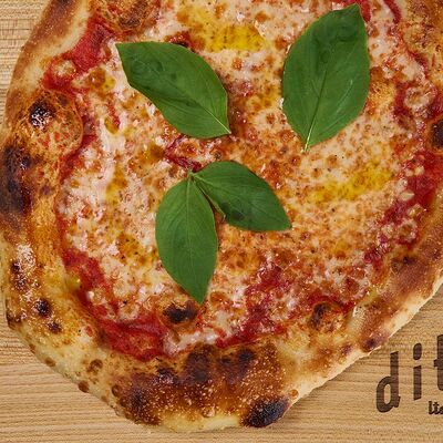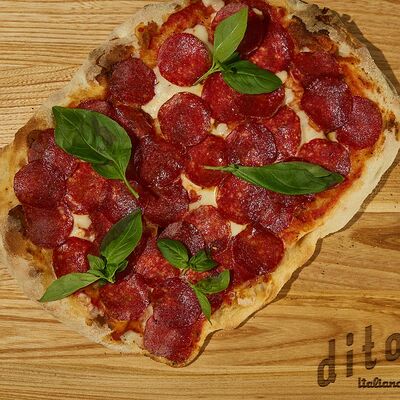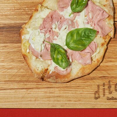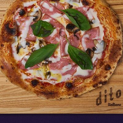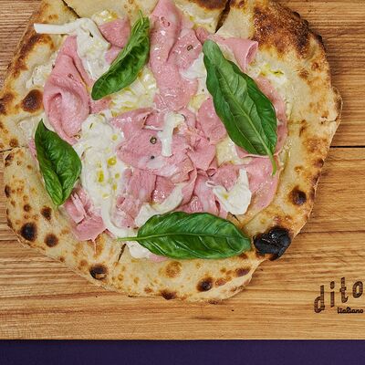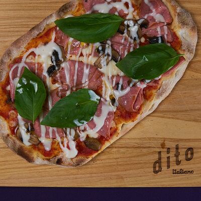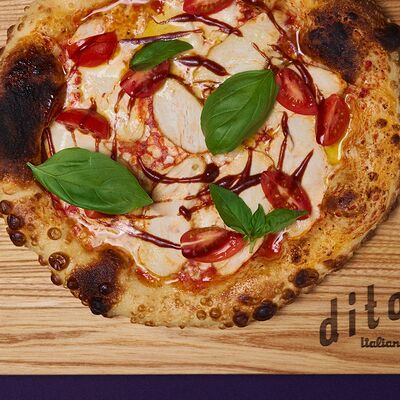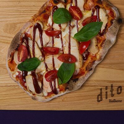 Тесто для пиццы, масло оливковое, томатный соус для пиццы, моцарелла, куриное филе, томаты черри, соус барбекю, базилик