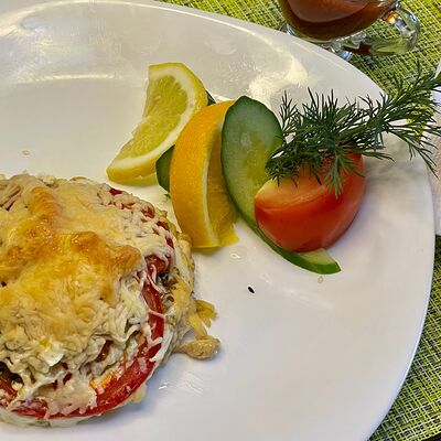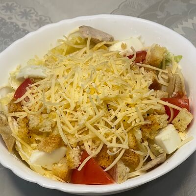 Курица халяль, сыр, сухарики, помидоры, яйцо, соус цезарь