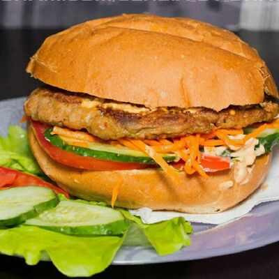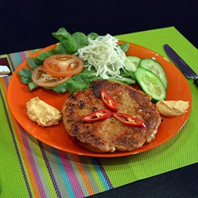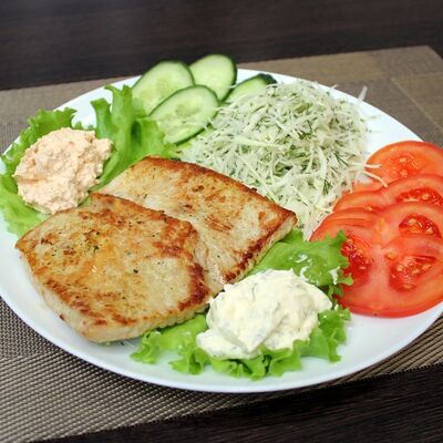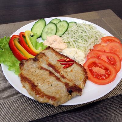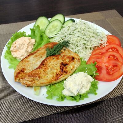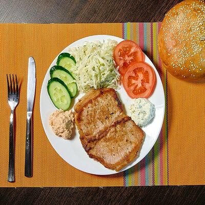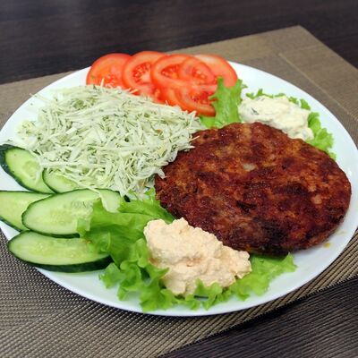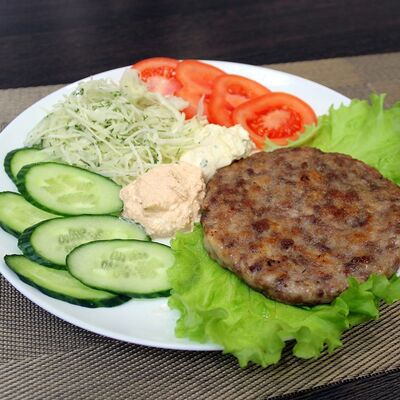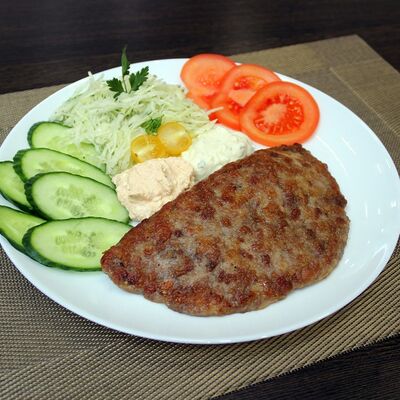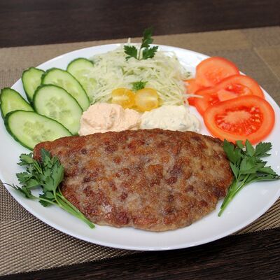 Плесковица cвинo-куриная, бекон, фирменный соус, овощной салат (огурец, капуста, помидор), булка