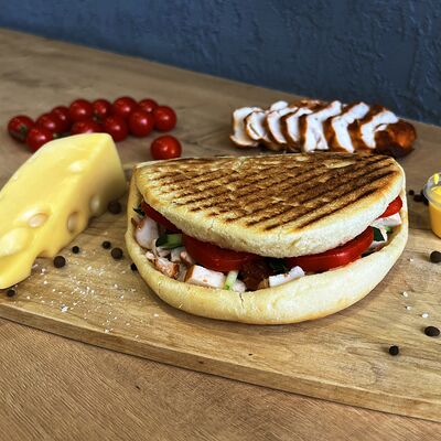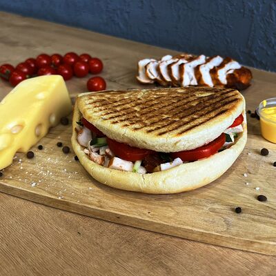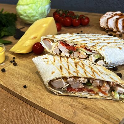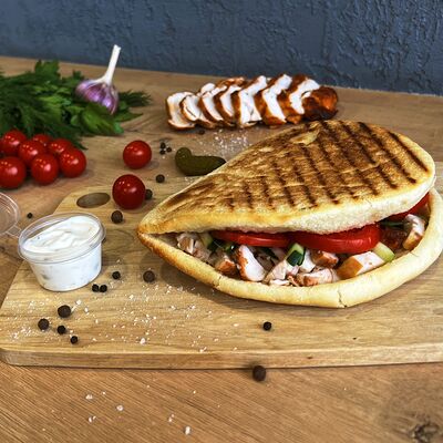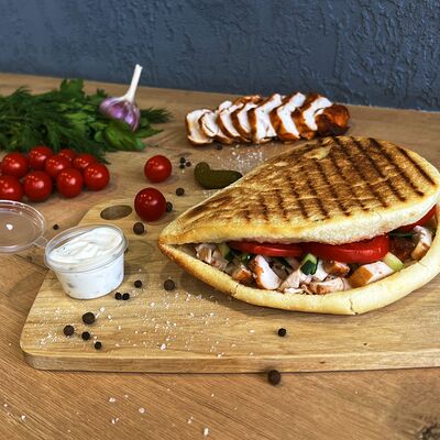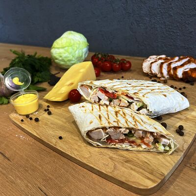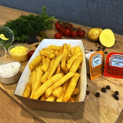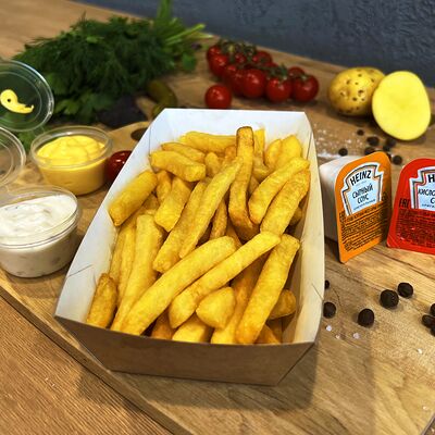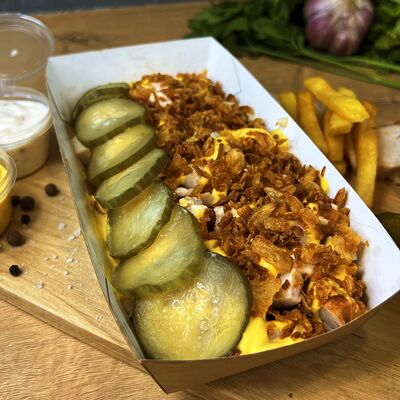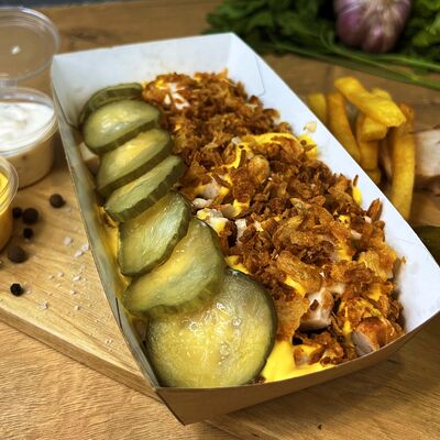 Картошка фри, куриное филе, сырный соус, чесночный соус, маринованные огурцы, пассерованный лук