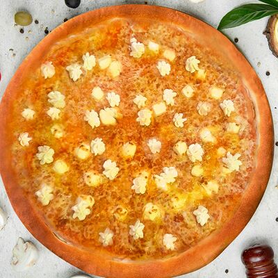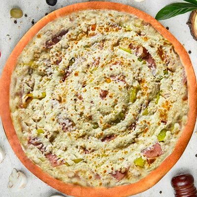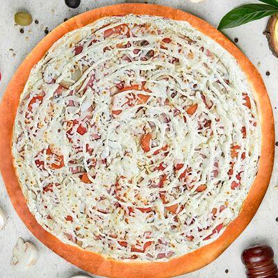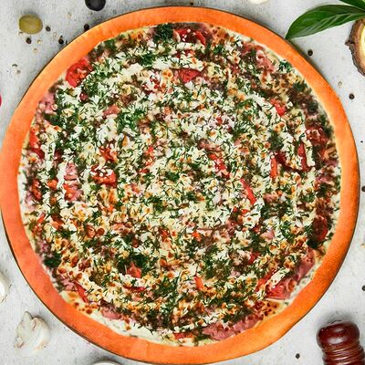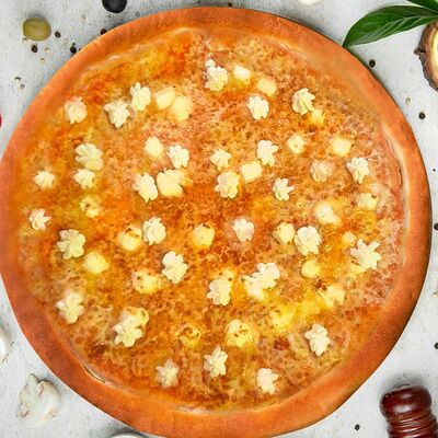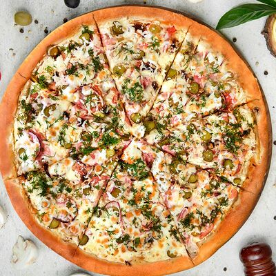Карбонад, корнишоны, картофельное пюре, шампиньоны, соус сметана-грибы, красный лук, моцарелла, укроп (36 см)