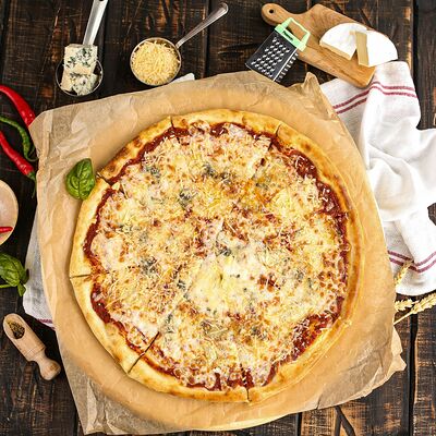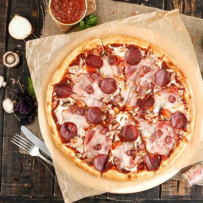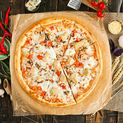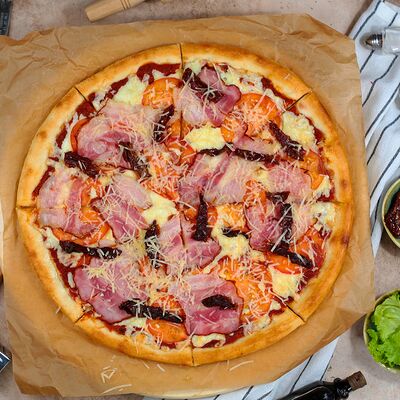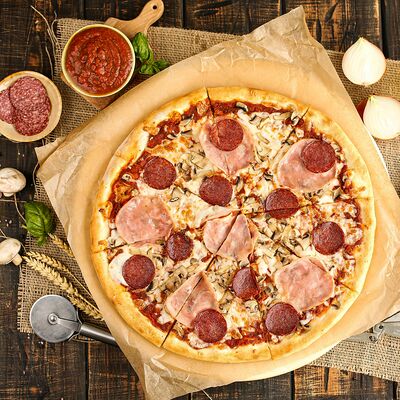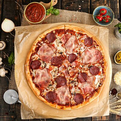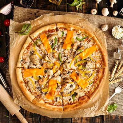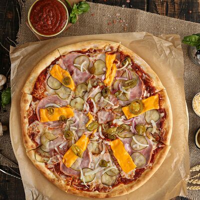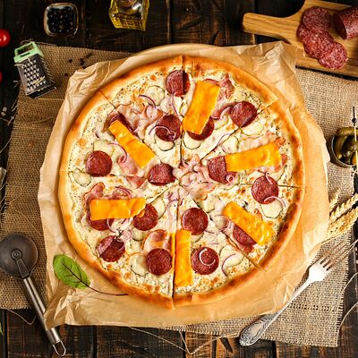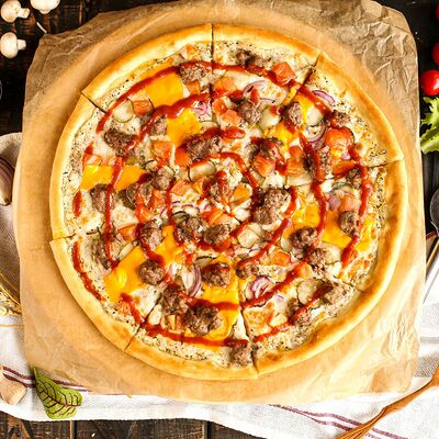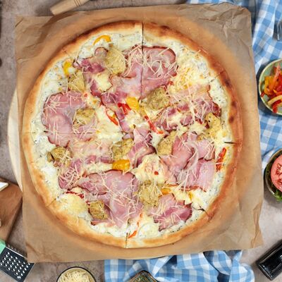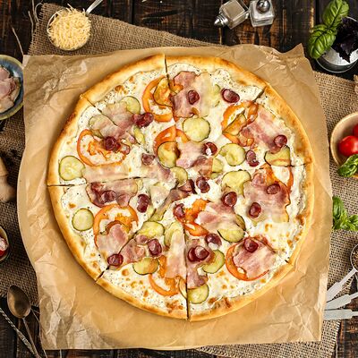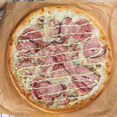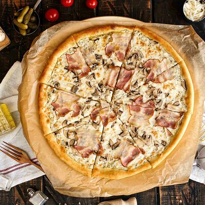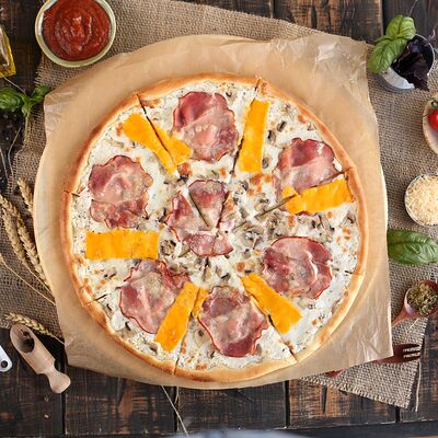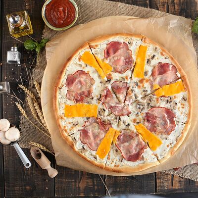 Белый соус, моцарелла, шампиньоны, окорок, сыр Чеддер (33 см)