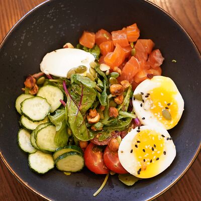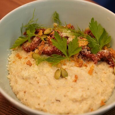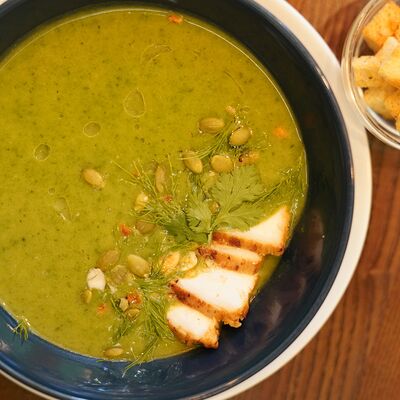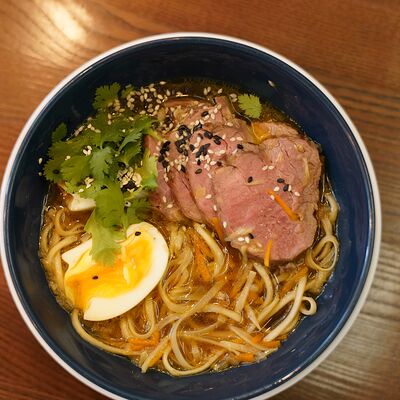 Говяжий бульон, лапша яичная, говядина запеченная, яйцо куриное, морковь, лук репчатый, чеснок, масло подсолнечное, соевый соус, зелень, соль