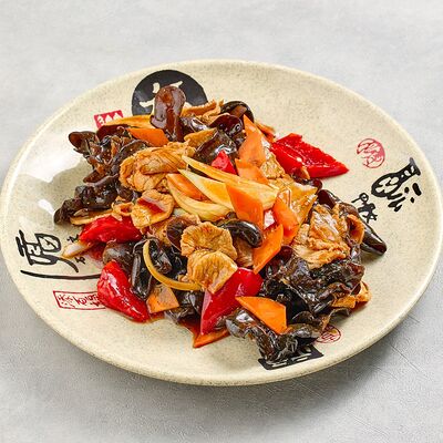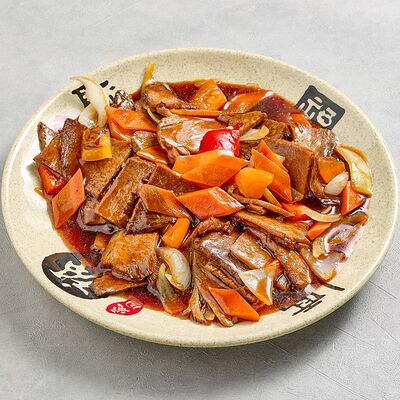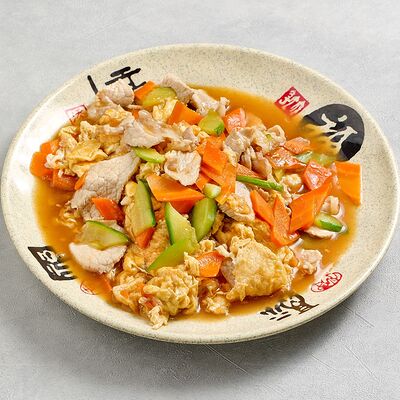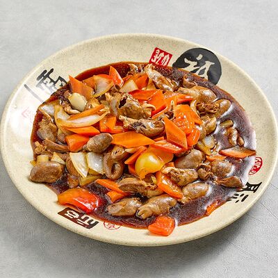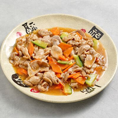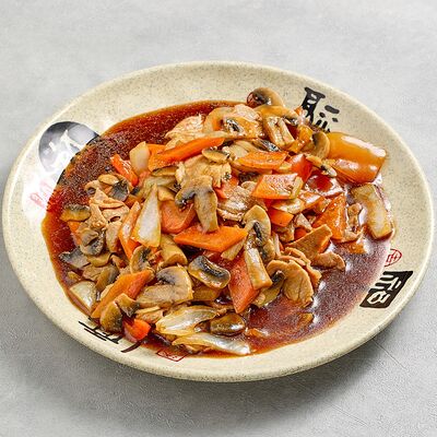Куриное филе, крахмал, морковь, лук. В кисло-сладком соусе гоу бао жоу