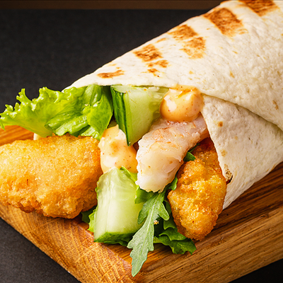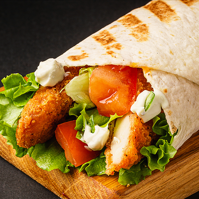 Куриные стрипсы, Чеддер, помидор, маринованные огурчики с соусом Тэйсти на бриоши