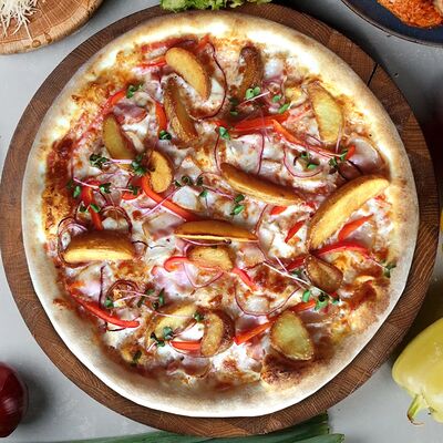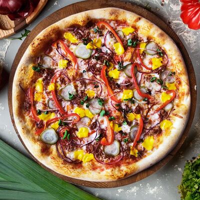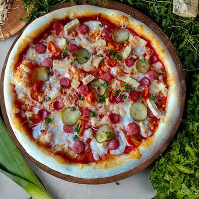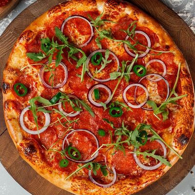 Соус из томатов, сыр моцарелла, лук красный, колбаска пепперони, перец халапеньо, зелень, фирменный соус для бортиков (30 см)