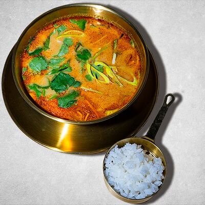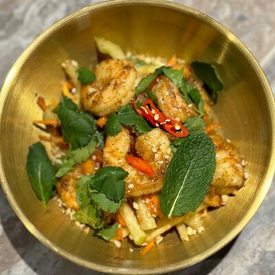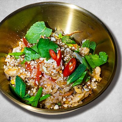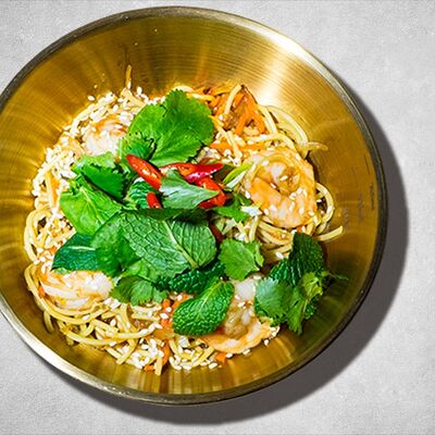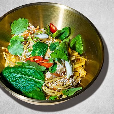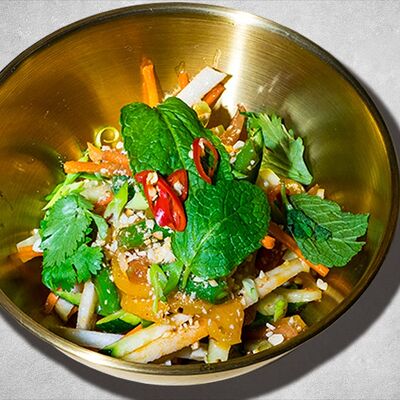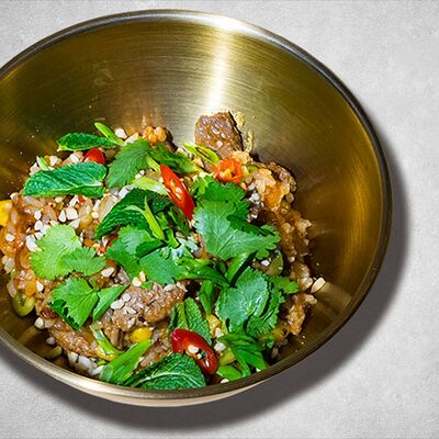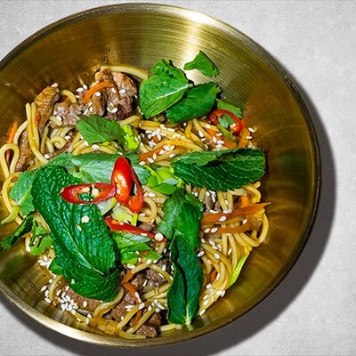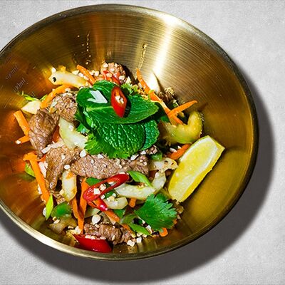 Овощной салат с говядиной, заправленный кунжутным маслом и соусом пад тай (морковь, капуста кольраби, фасоль стручковая, огурец, помидор, лайм, чили перец, мята, кинза, кунжутное масло, арахис, соевый соус)
