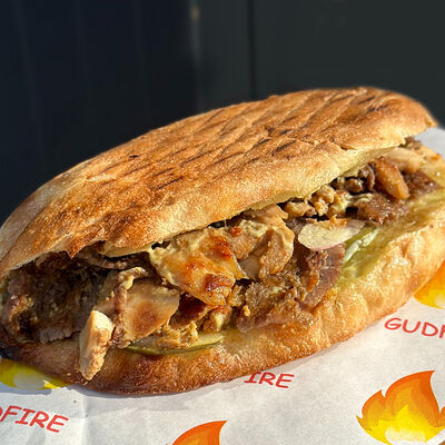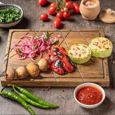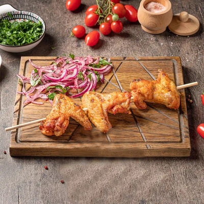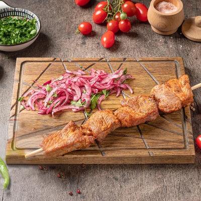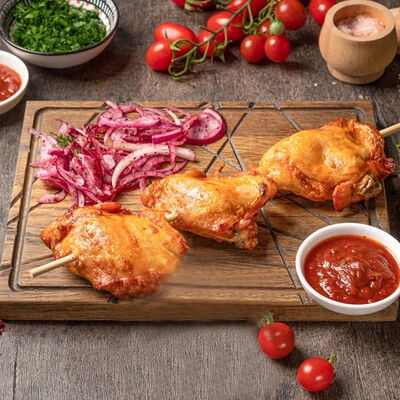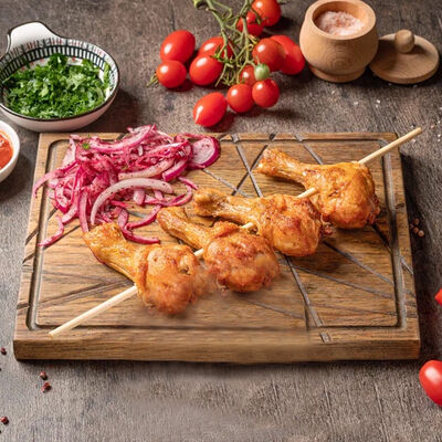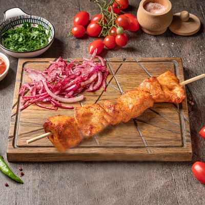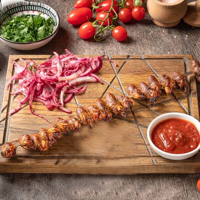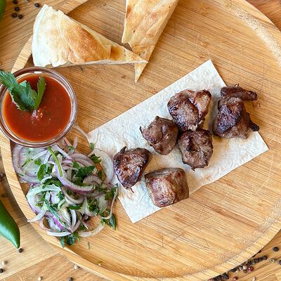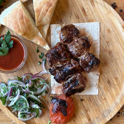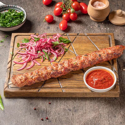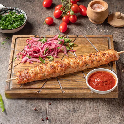 Обжаренный на древесных углях куриный фарш с зеленью и специями. Подаётся с луком, зеленью, тонким лавашом