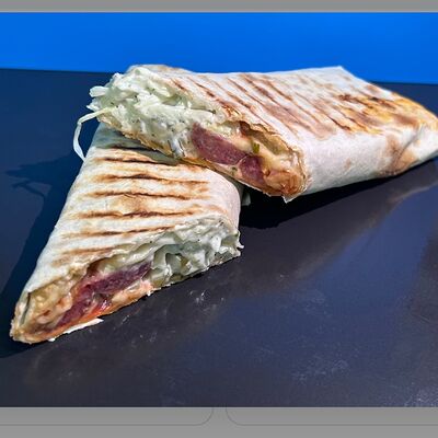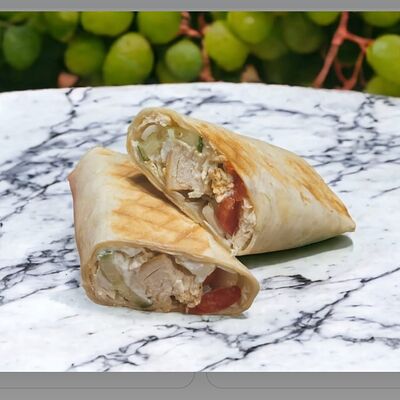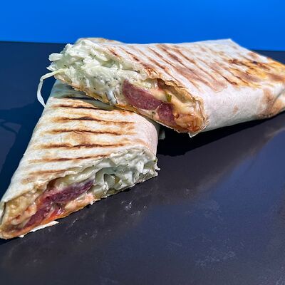 Свинина, жареный лук, лаваш, капуста свежая, помидор, свежий огурец, соус тартар
