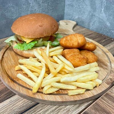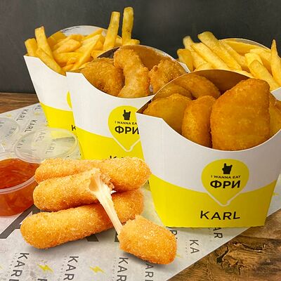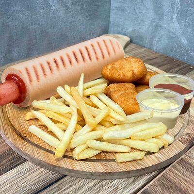 Французский хот-дог с сосиской (булка, сосиска, соус датский, кетчуп, 1 шт.), Картофель Фри (75 г), Наггетсы (6 шт.), Соус Кетчуп (20 г), Соус сырный (20 г)