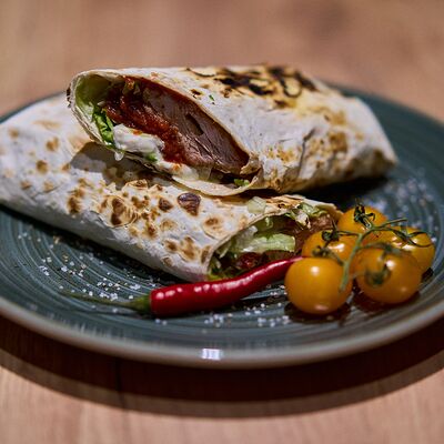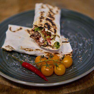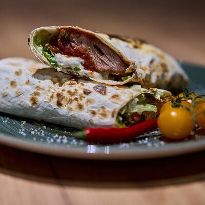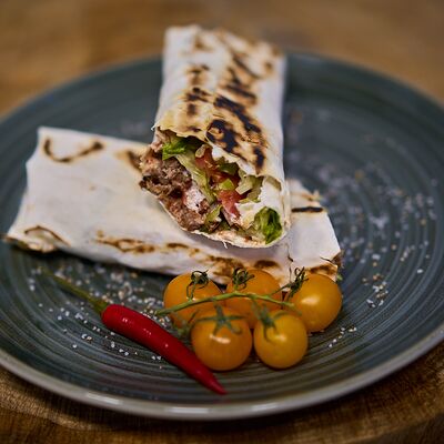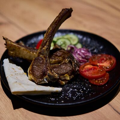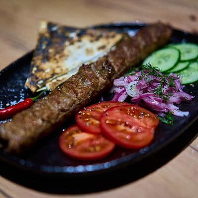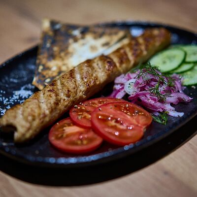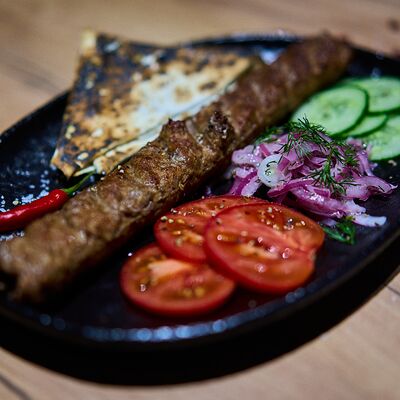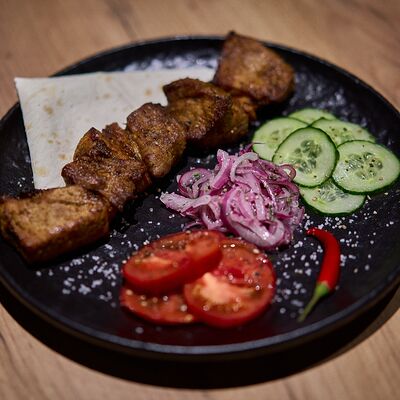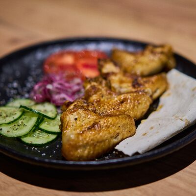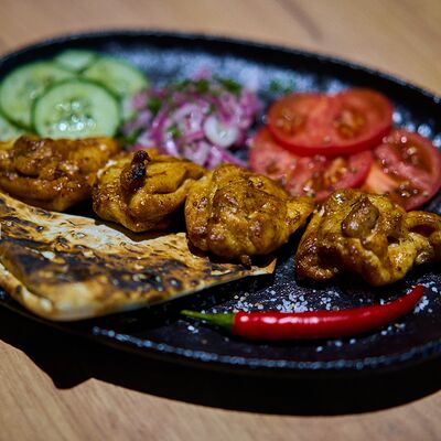 Куриное бедро, обжаренное на углях, подается с маринованным луком, свежими помидорами, огурцами, тонким лавашом и красным соусом