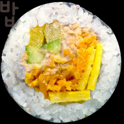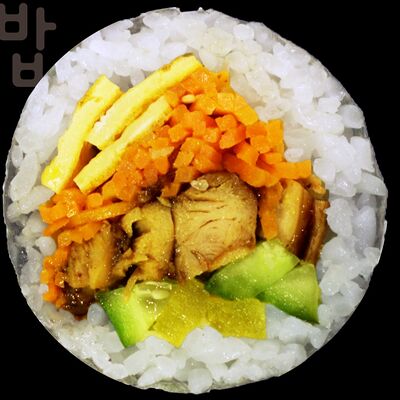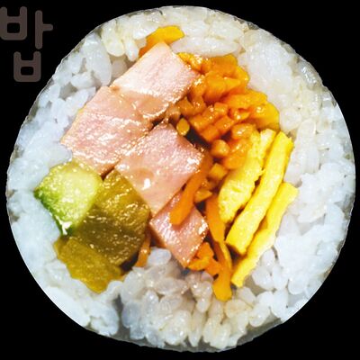 Ветчина обжаренная, рис, морковь, омлет, огурец, редька танмуджи, лист нори, кунжут