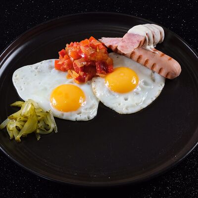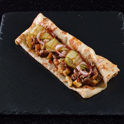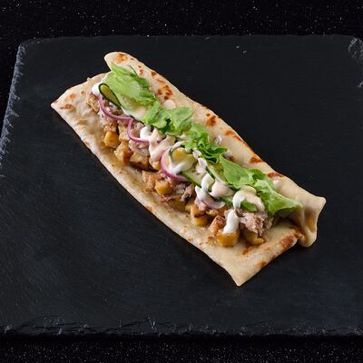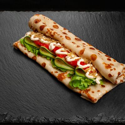 Курица запеченная, салат айсберг, томаты свежие, огурцы свежие, картофель пай, соус розовый, мука, яйцо, сахар, молоко, масло