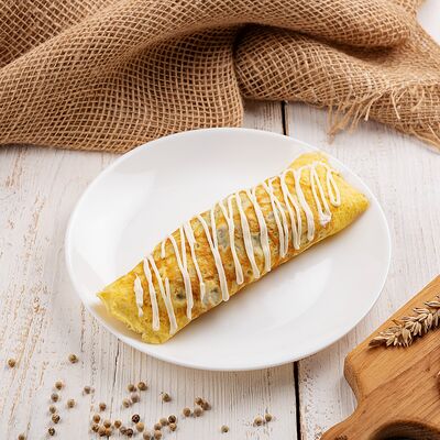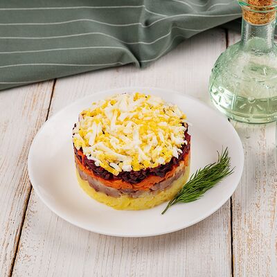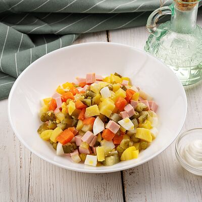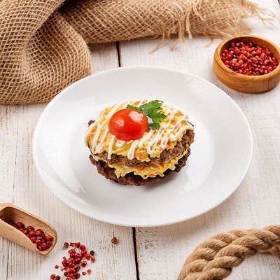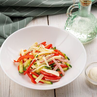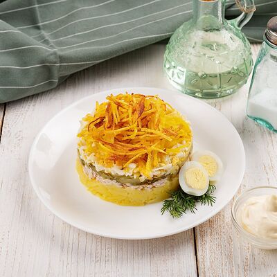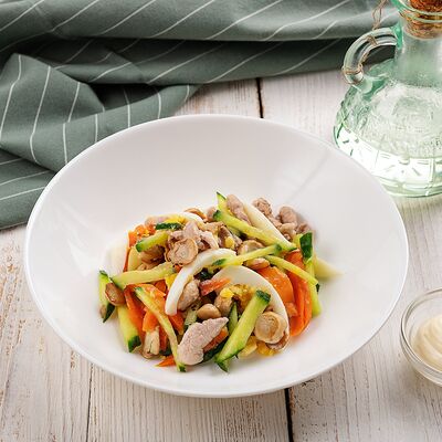 Свинина обжаренная, морковь, жареные шампиньоны, огурец, яйцо, майонез