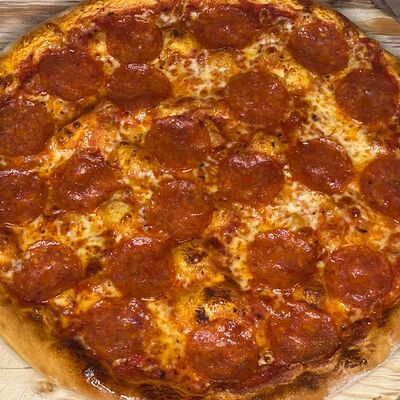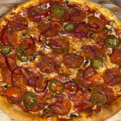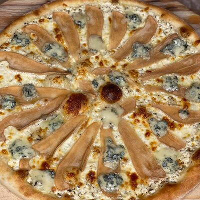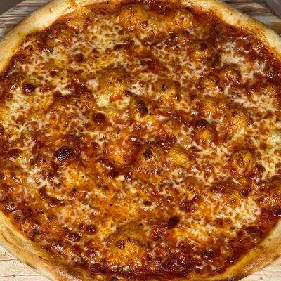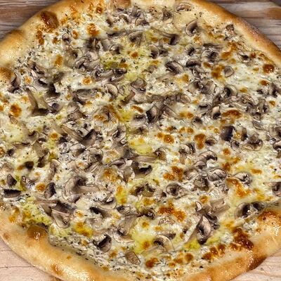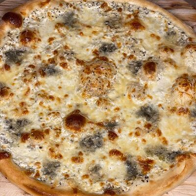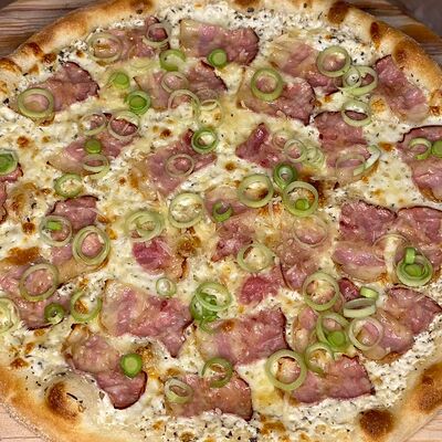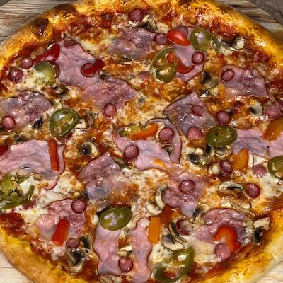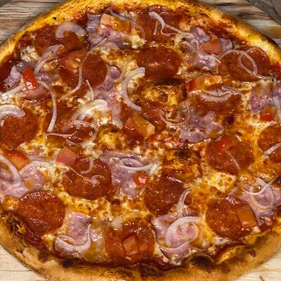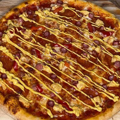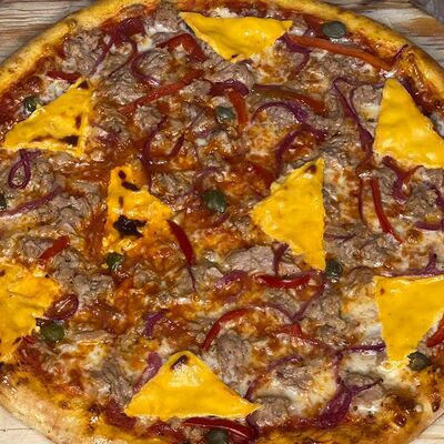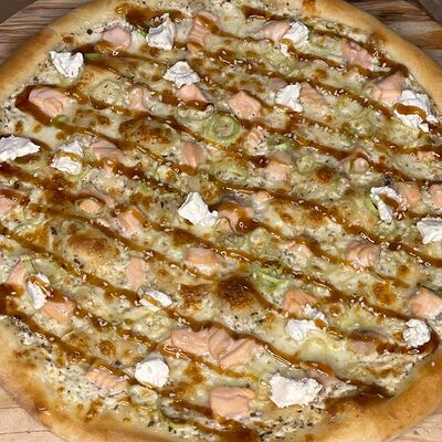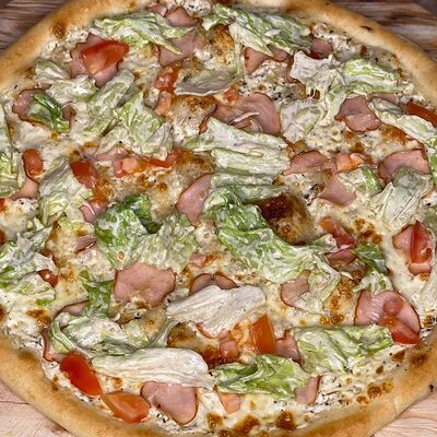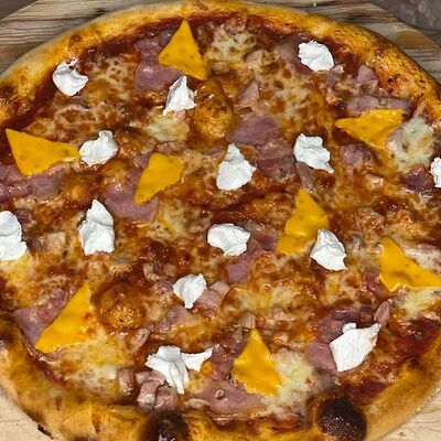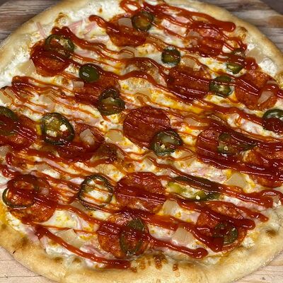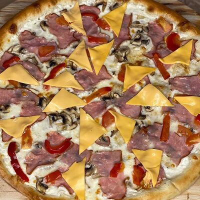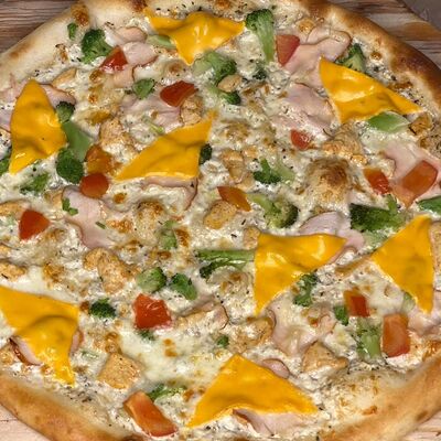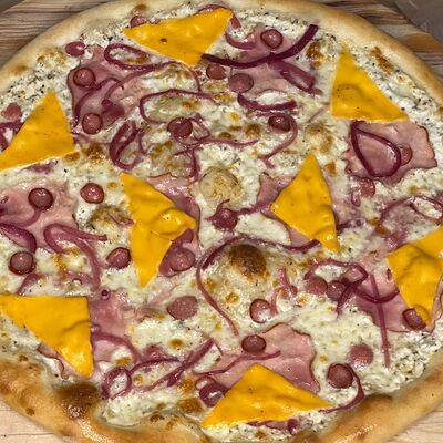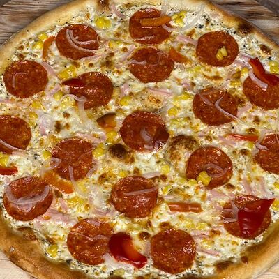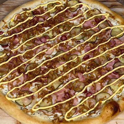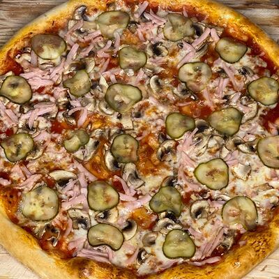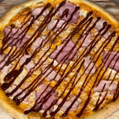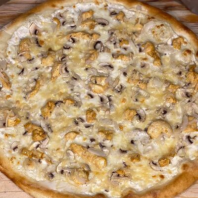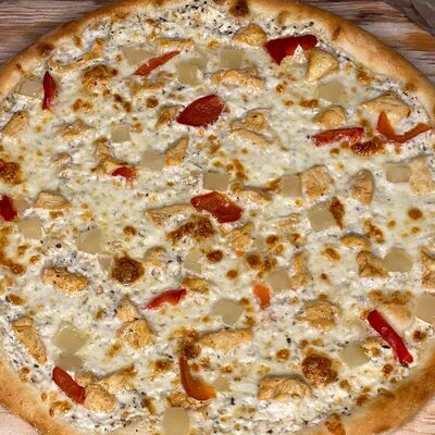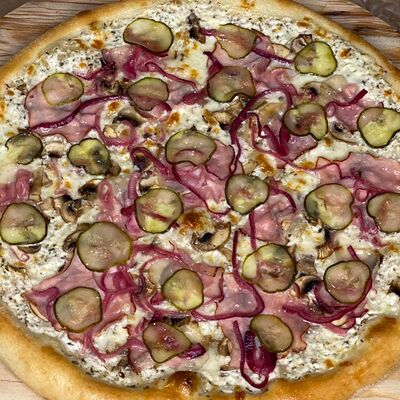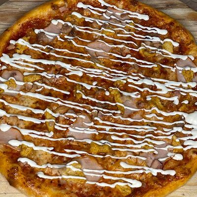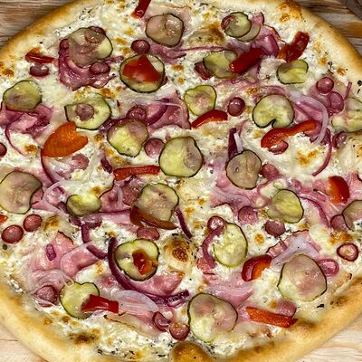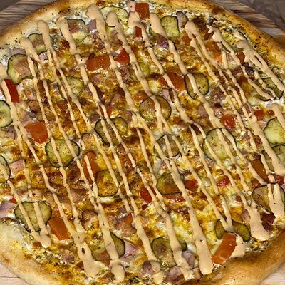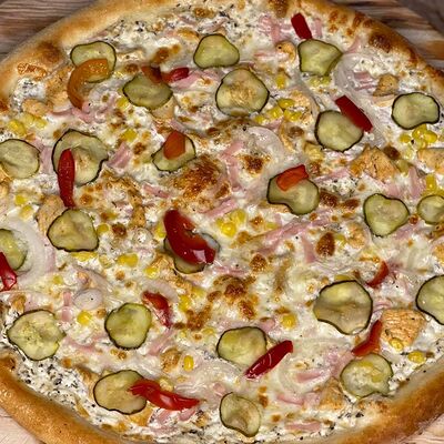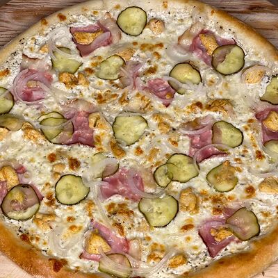 Белый соус, сыр моцарелла, маринованное куриное филе, грудинка свиная, маринованные огурцы, маринованный лук репчатый (33 см)