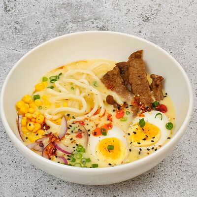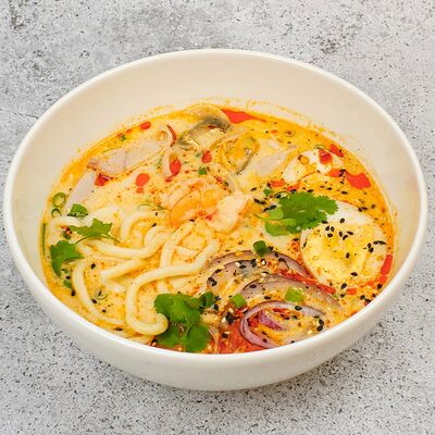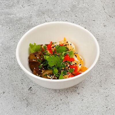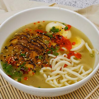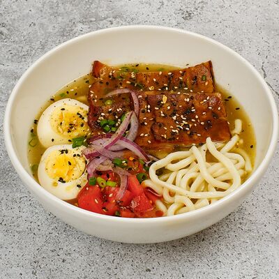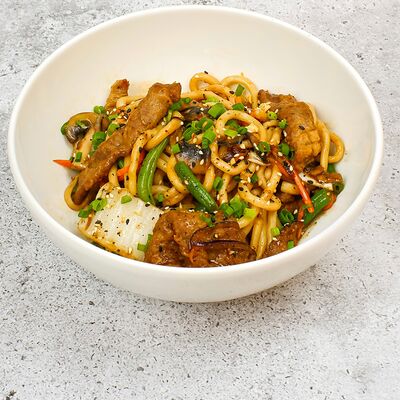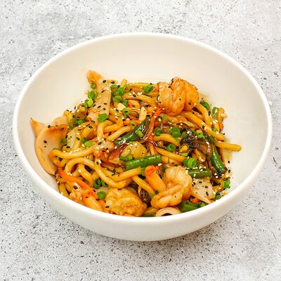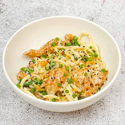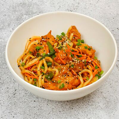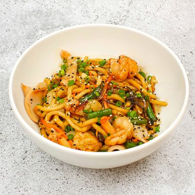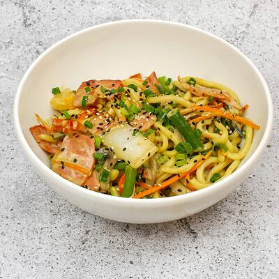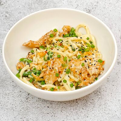 Лапша пшеничная, курица, яйцо, лук зеленый, нори, кунжут, арахис, соевый соус, лук красный