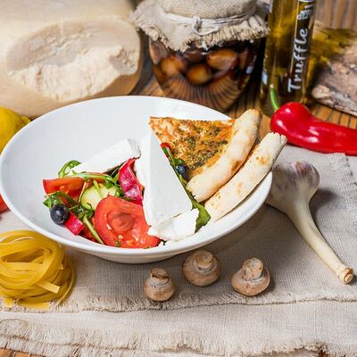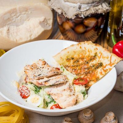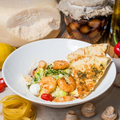 Креветка тигровая, айсберг, рукола, сыр пармезан, помидоры черри, соус цезарь, яйцо перепелиное, лепешка с соусом песто и сыром