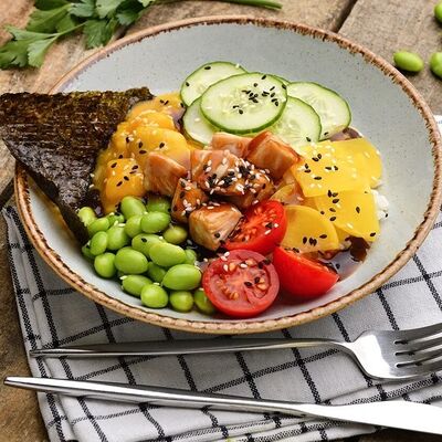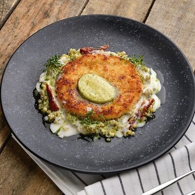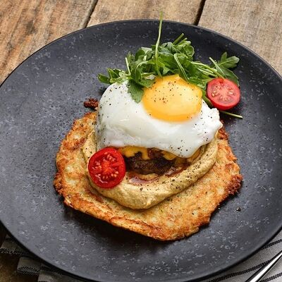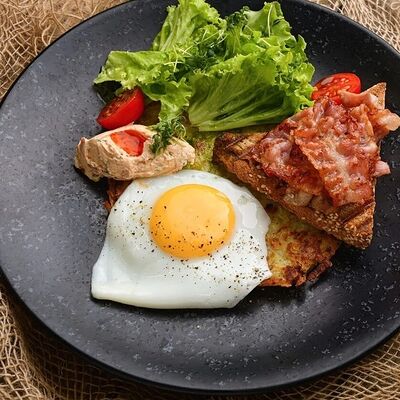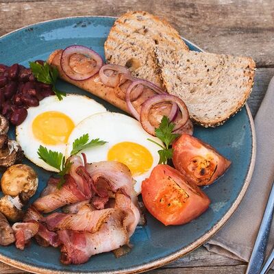 Традиционный Английский завтрак. Глазунья из двух яиц, подается с колбаской гриль, жареными шампиньонами, луком, беконом; тушеной фасолью в томатном соусе и мультизерновым тостом. Колбаска (говядина, шпик cвинoй, крахмал), яйцо, помидор, бекон cвинoй, шампиньоны, фасоль красная, мука пшеничная, лук красный репчатый, масло раст, мука ржаная, зелень, хлопья овсяные, кунжут, семя подсолничника, семя льна, мак, соль, дрожжи, солод ржаной, помидоры в собственном соку