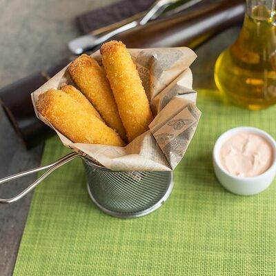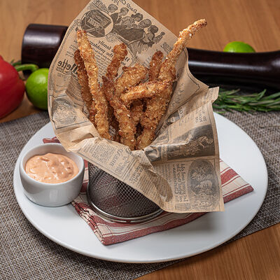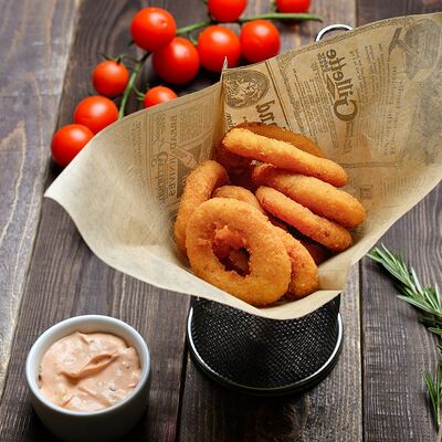 Луковые кольца обжаренные во фритюре. Подаются с соусом Спайс