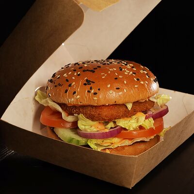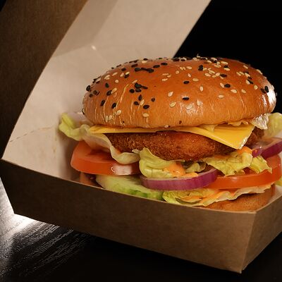 Чизбургер с курицей. Котлета из куриной грудки в булочке с кунжутом, сыром, помидорами, огурцами, салатом айсберг и соусом бургер