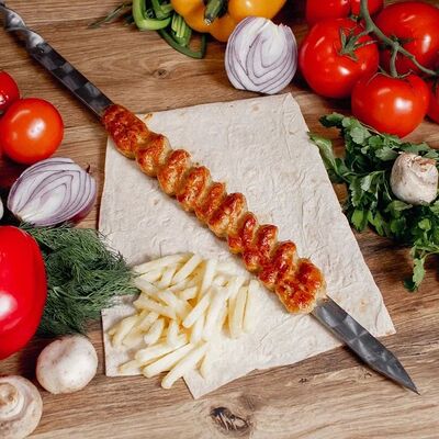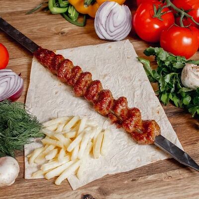 Обжаренный на древесных углях говяжий фарш с зеленью и специями. Подается с маринованным луком, салатом и тонким лавашом