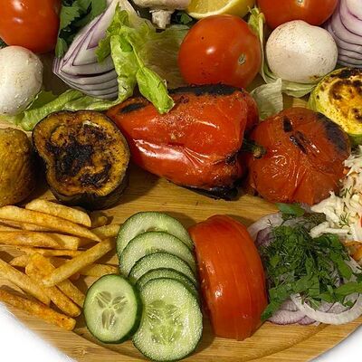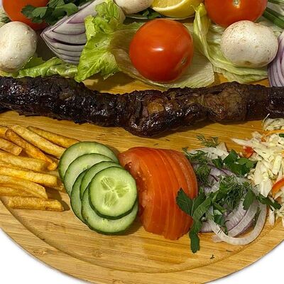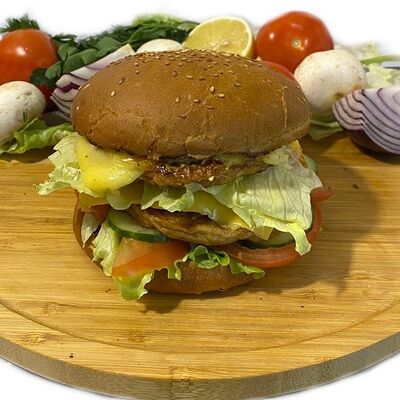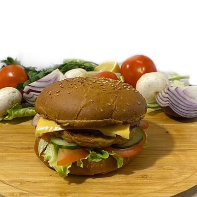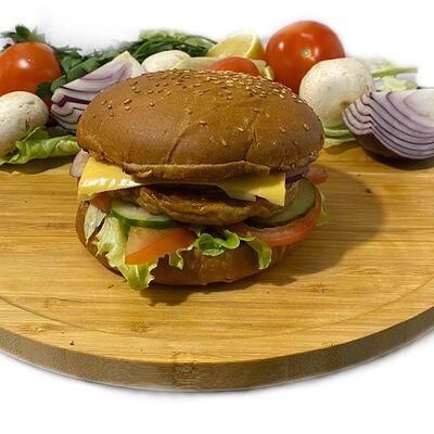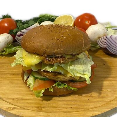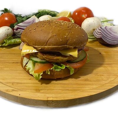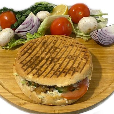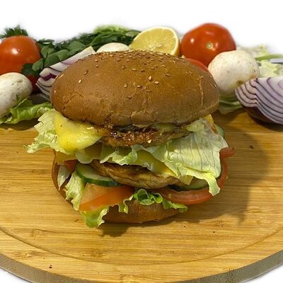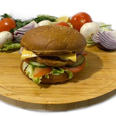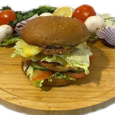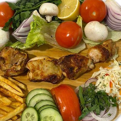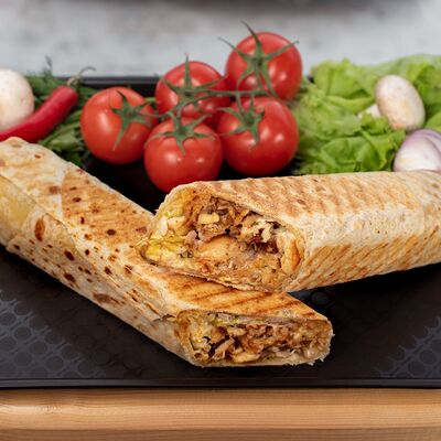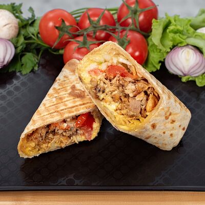 Филе куриного бедра без кости, сырная тортилья (3 шт.), маринованные огурцы, помидор, сыр гауда, сырный соус, салат из молодой капусты с болгарским перцем, петрушкой, лимонным соком и морковью