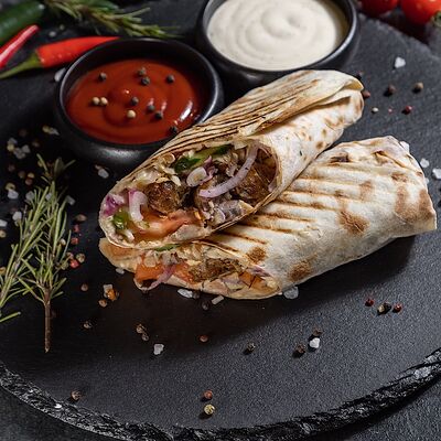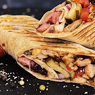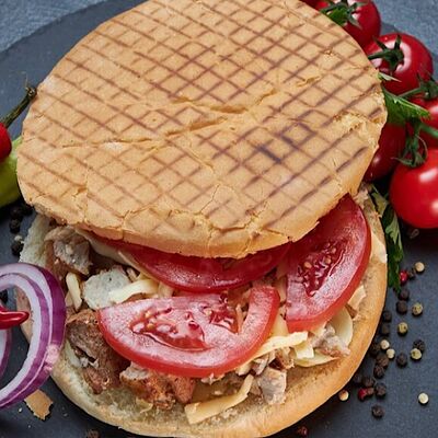 Филе куриного бедра, сыр голландский, помидоры, маринованный огурец, капуста, соус барбекю