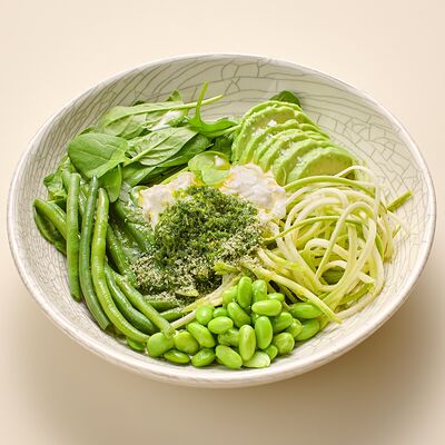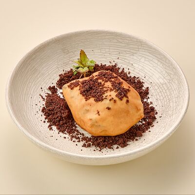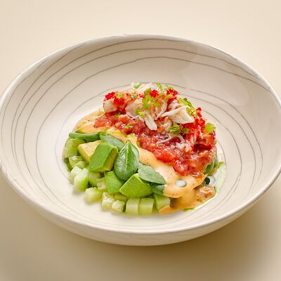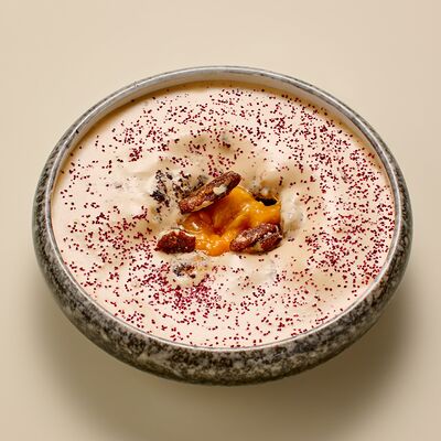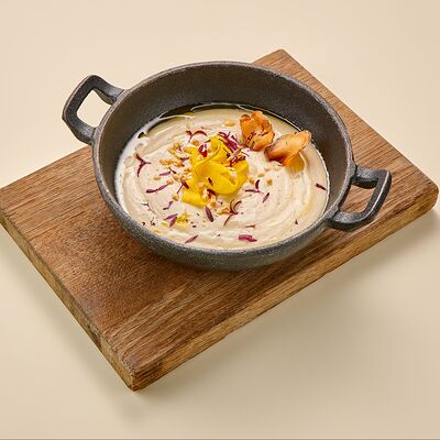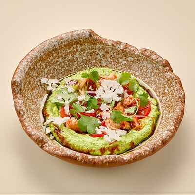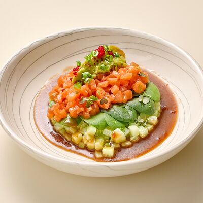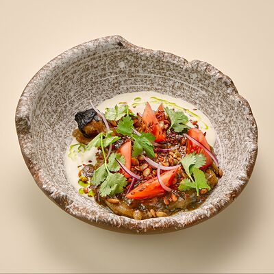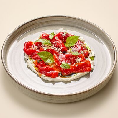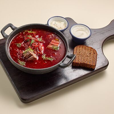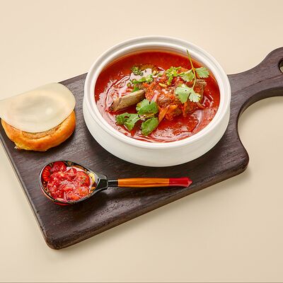 Бульон говяжий, говяжьи ребра, помидоры, болгарский перец, лук красный, аджика, кинза, попкорн из злаков, зелень