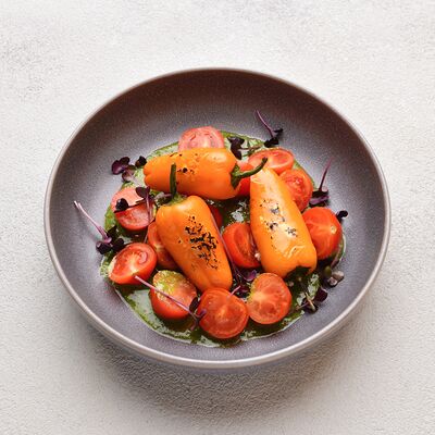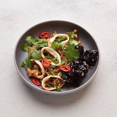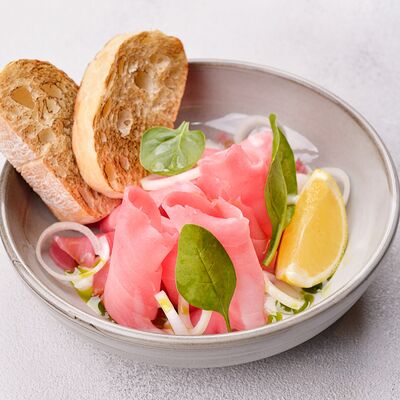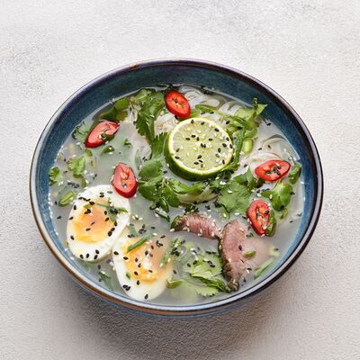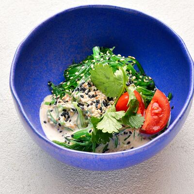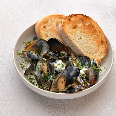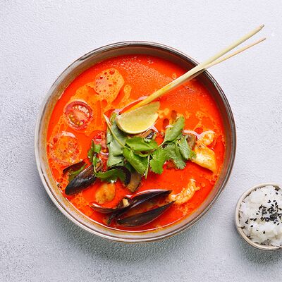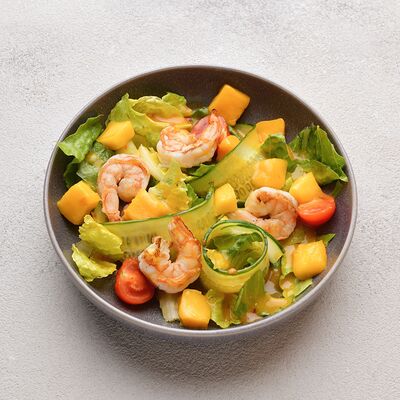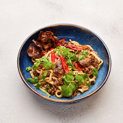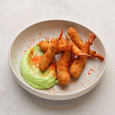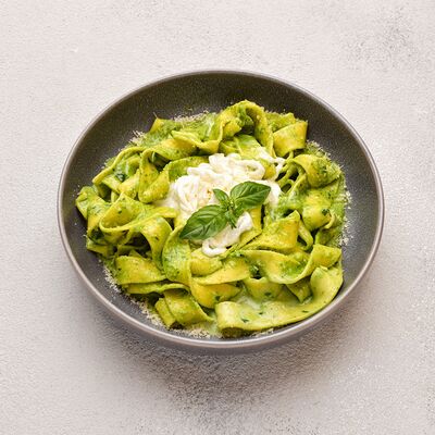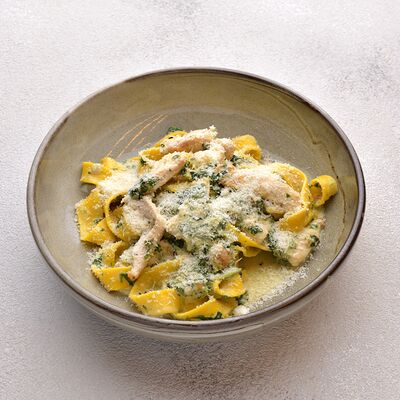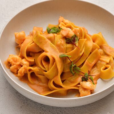 Фирменная лапша паппарделле с креветками и соусом на основе сливок и креветочных панцирей