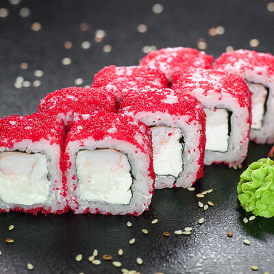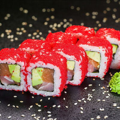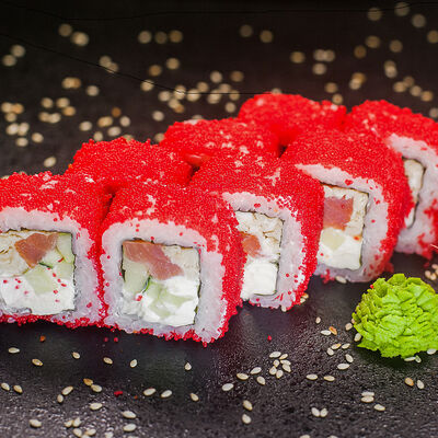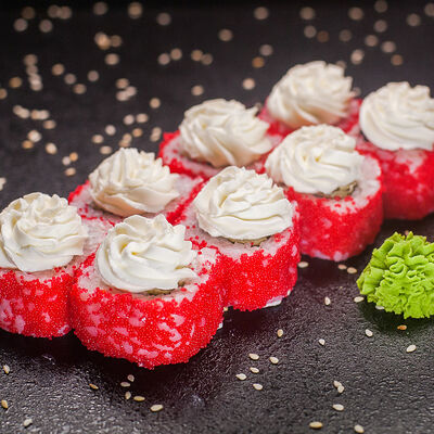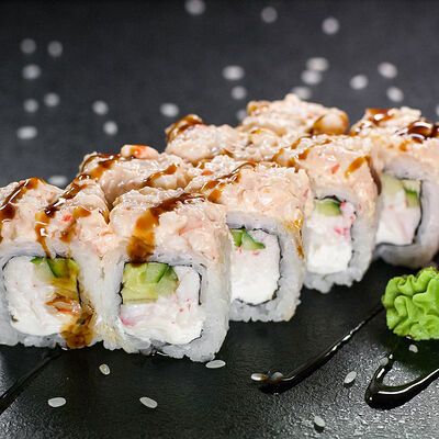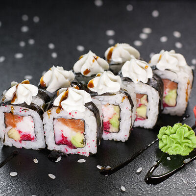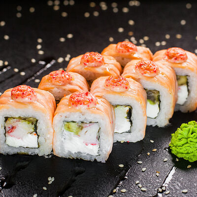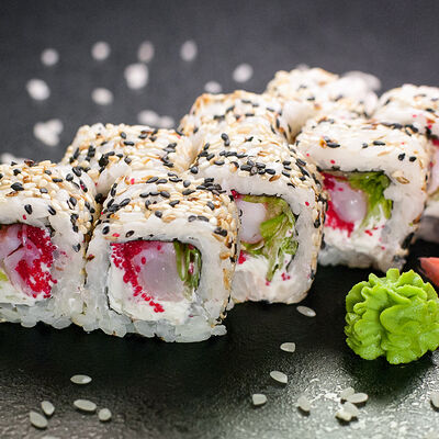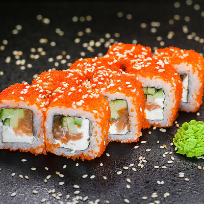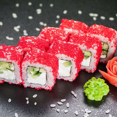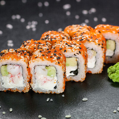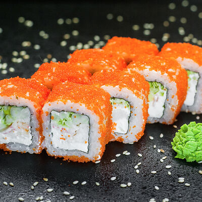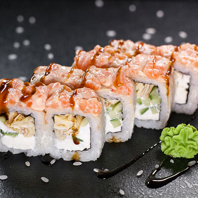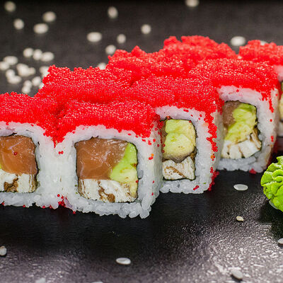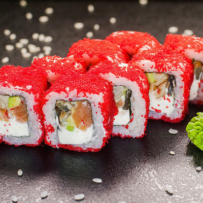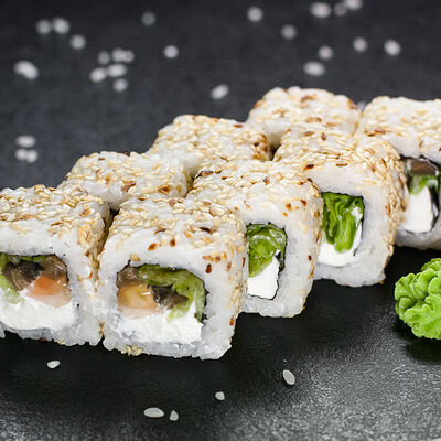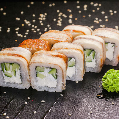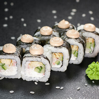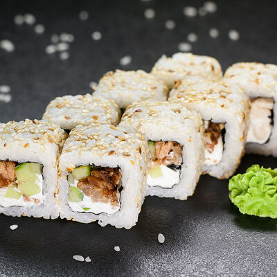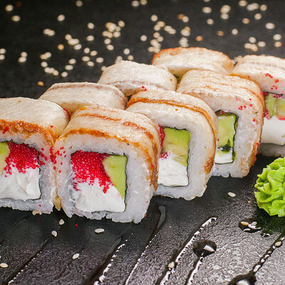 Угорь, сливочный сыр, масаго, авокадо, соус терияки, кунжут