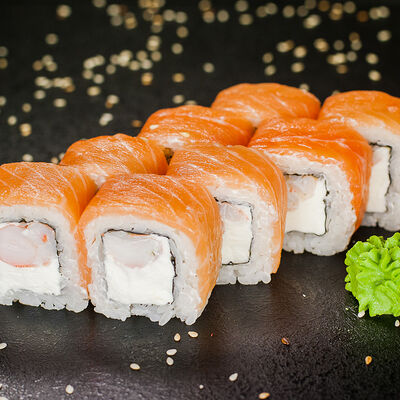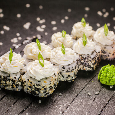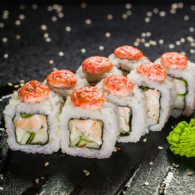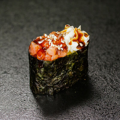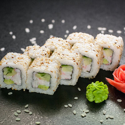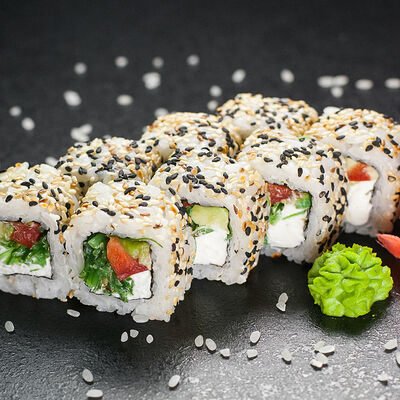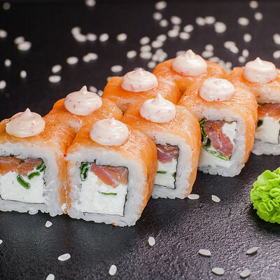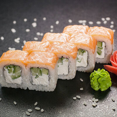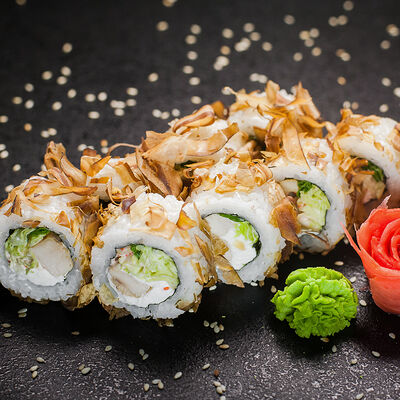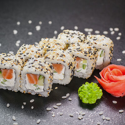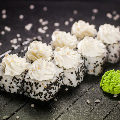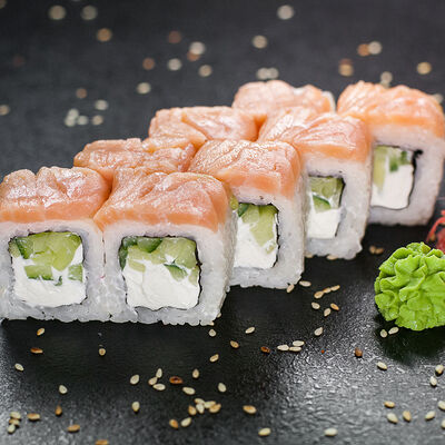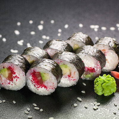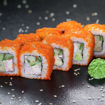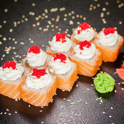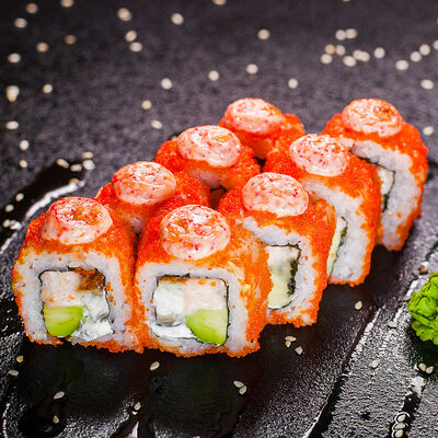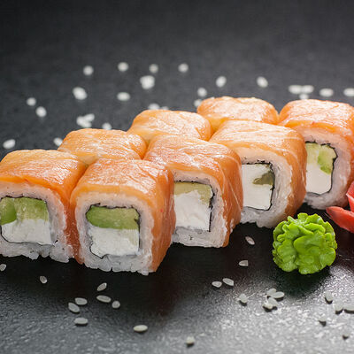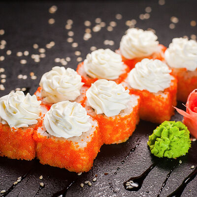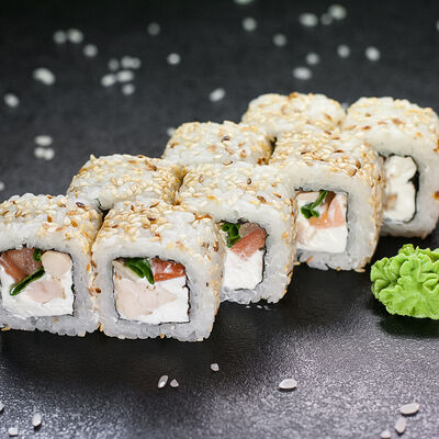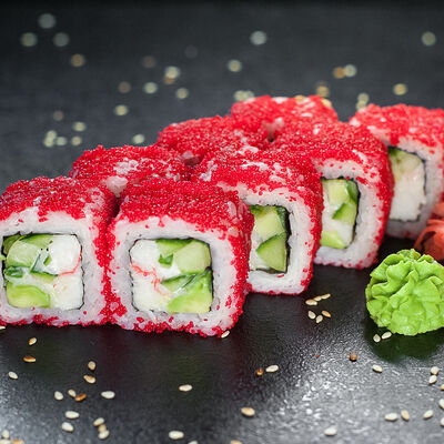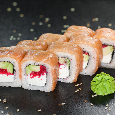Угорь, сливочный сыр, масаго, авокадо, соус терияки, кунжут