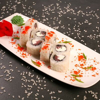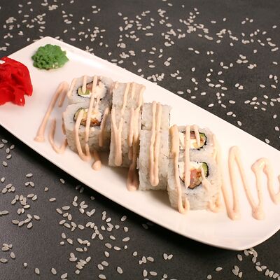 Сливочный сыр, салатная креветка, обжаренная в темпуре, авокадо, соус коктейльный