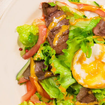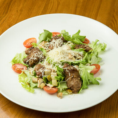 Говядина, грибы, лук, салат