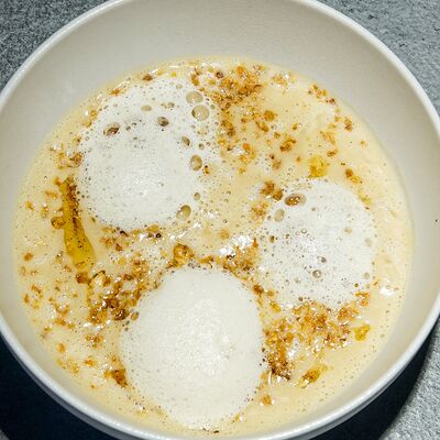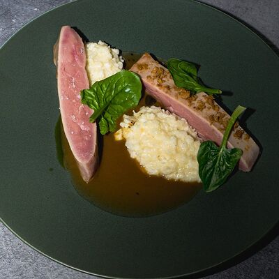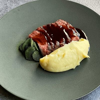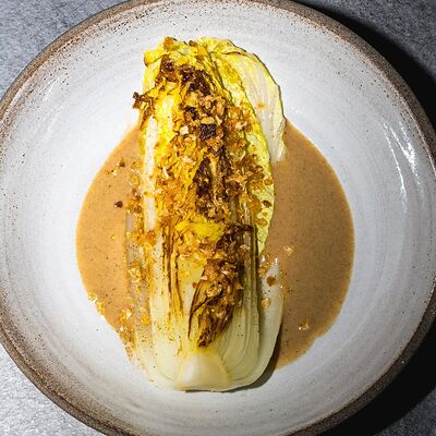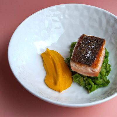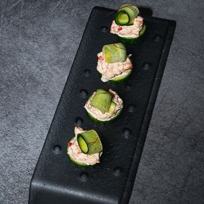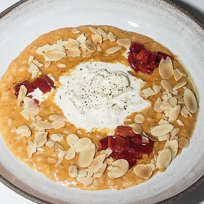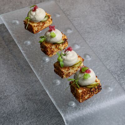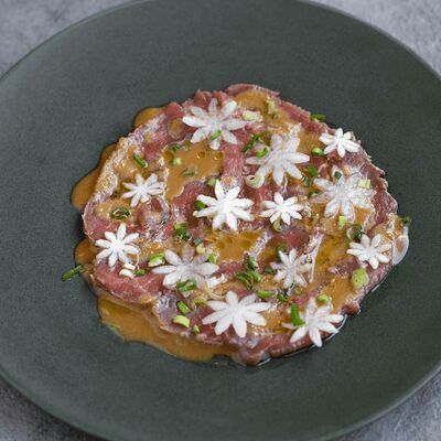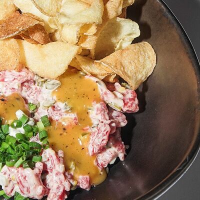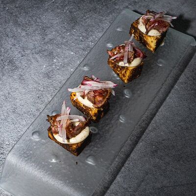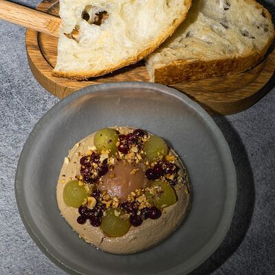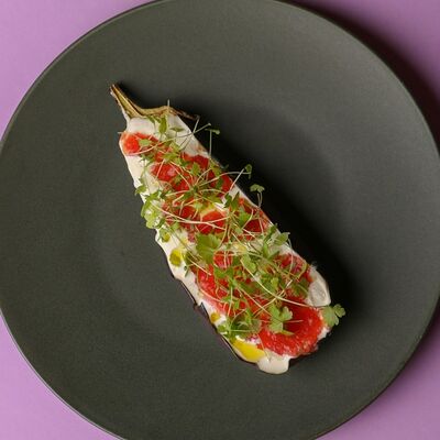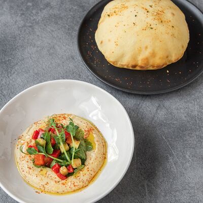 Нежный нутовый крем с тартаром из печеных овощей и греческой лепешкой