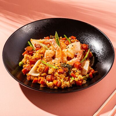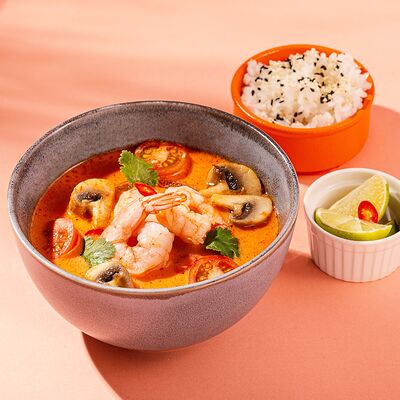 Том ям бульон, куриное филе, шампиньоны, томаты, рис, лук зеленый и кинза