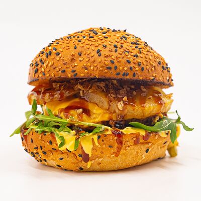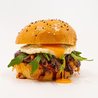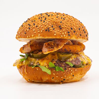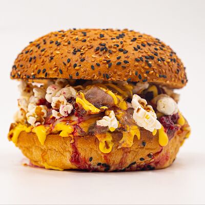 Идеально и с любовью он складывается на мягкой настоящей булочке бриошь. Сытная говяжья котлета на подложке из лука фри с добавлением маринованных огурчиков, жареного бекона, тертого сыра чеддер и сочетания двух авторских соусов собственного приготовления (черри руби и чеддер паприка). И изюминка от шефа - попкорн, который стал главной фишкой нашего бургера, покорив сердца постоянных клиентов