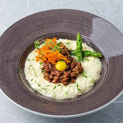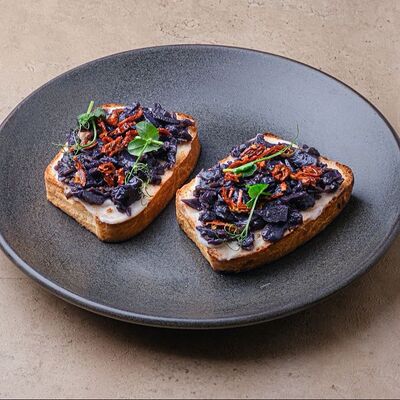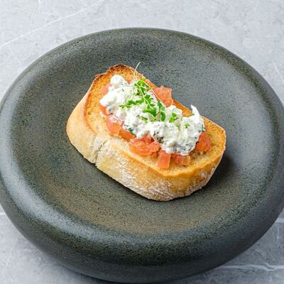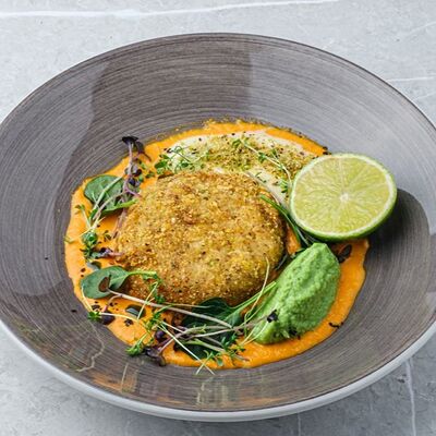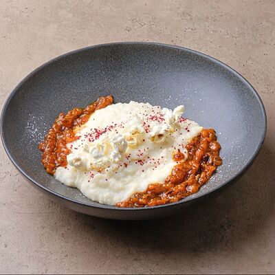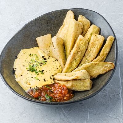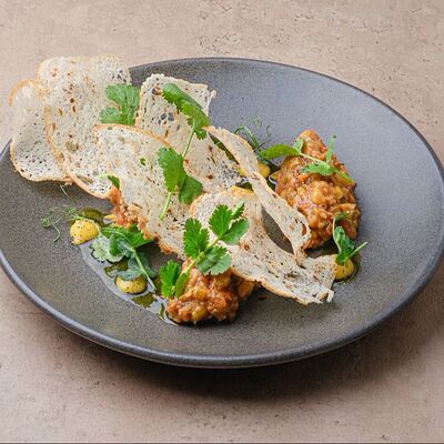 Баклажаны, томаты, кешью, моцарелла, кинза, рисовые чипсы