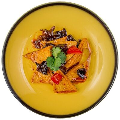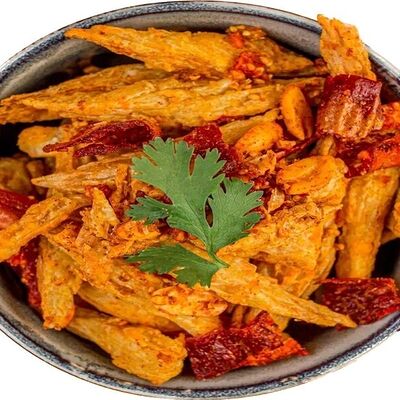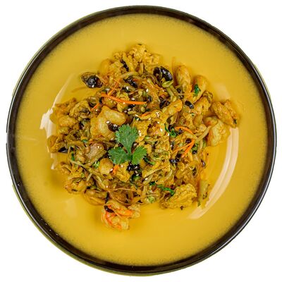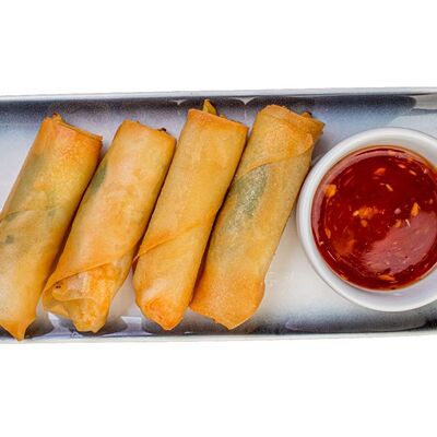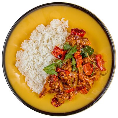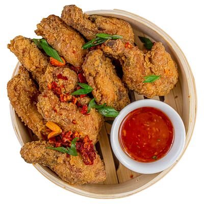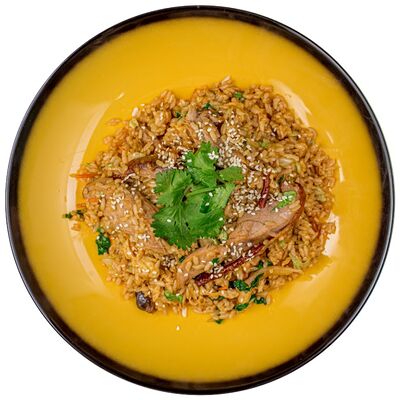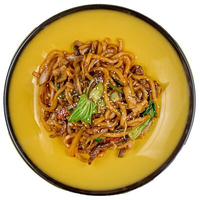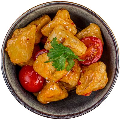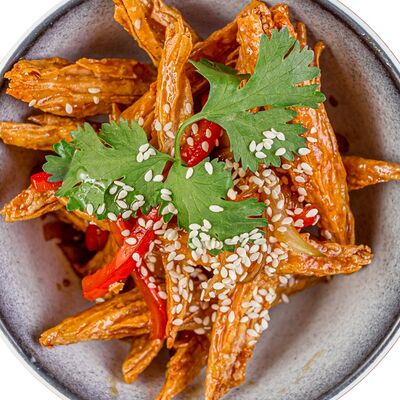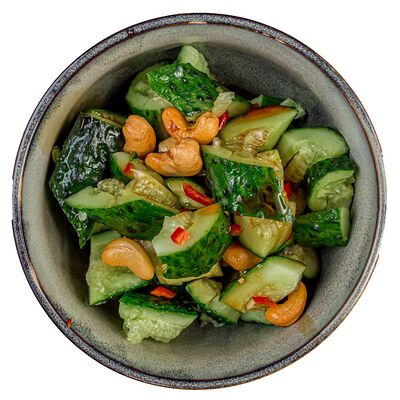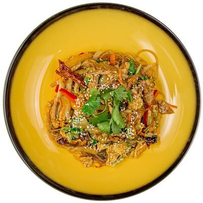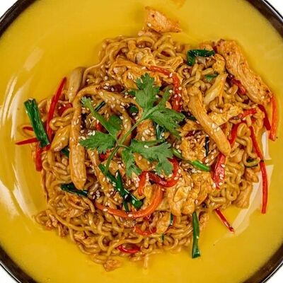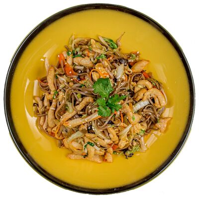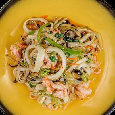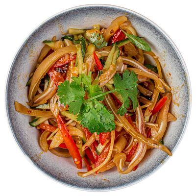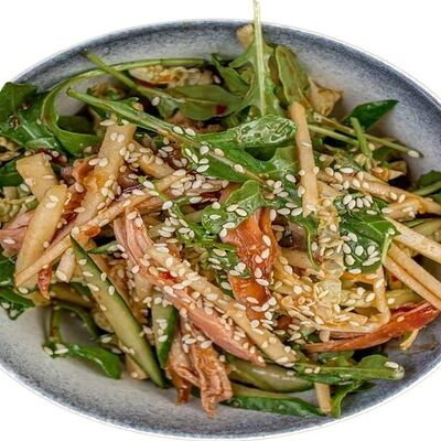 Салат со свежей руколой, сочным яблоком, нашей фирменной уткой по-пекински, заправленный соусами свит чили и хойсин